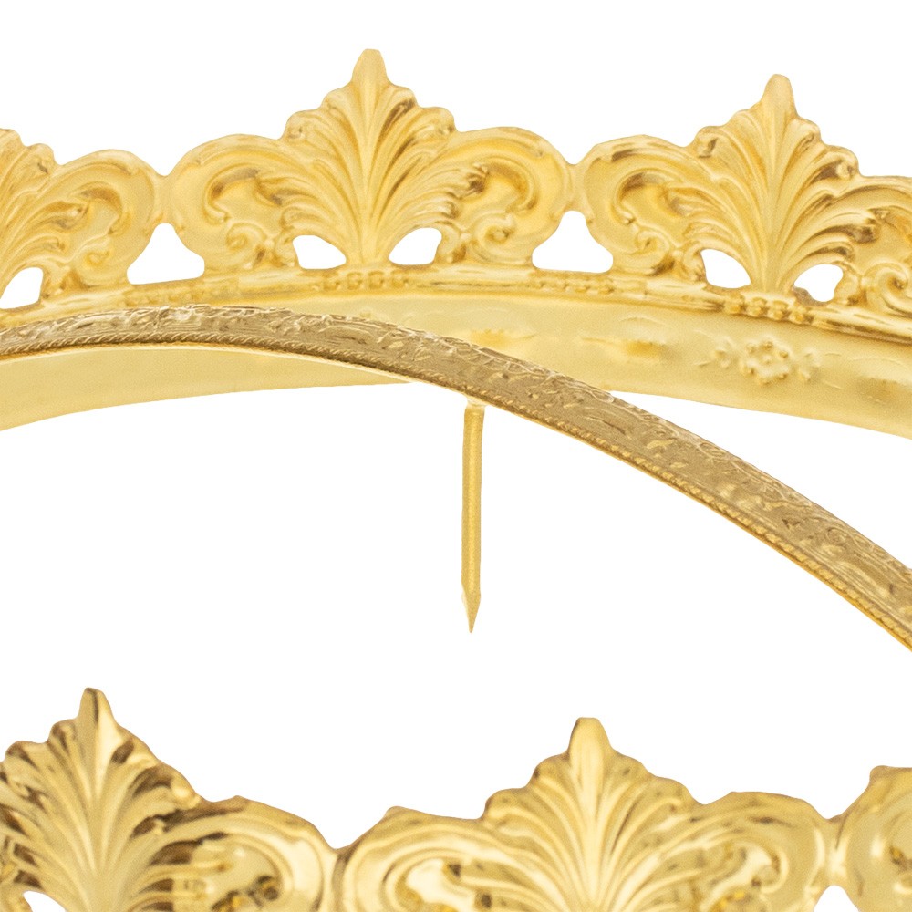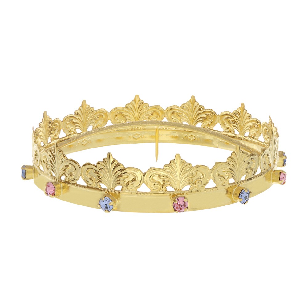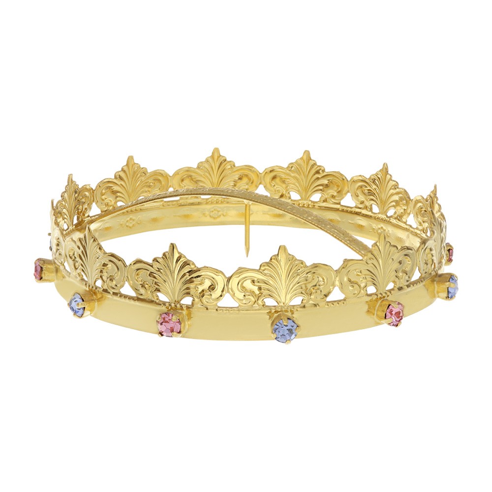 Mini coroncina per statue Madonna, realizzata in metallo dorato con strass applicati rosa e celesti.