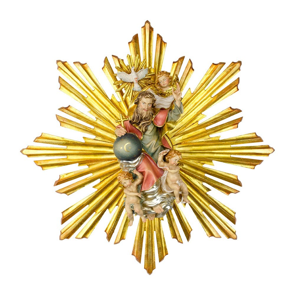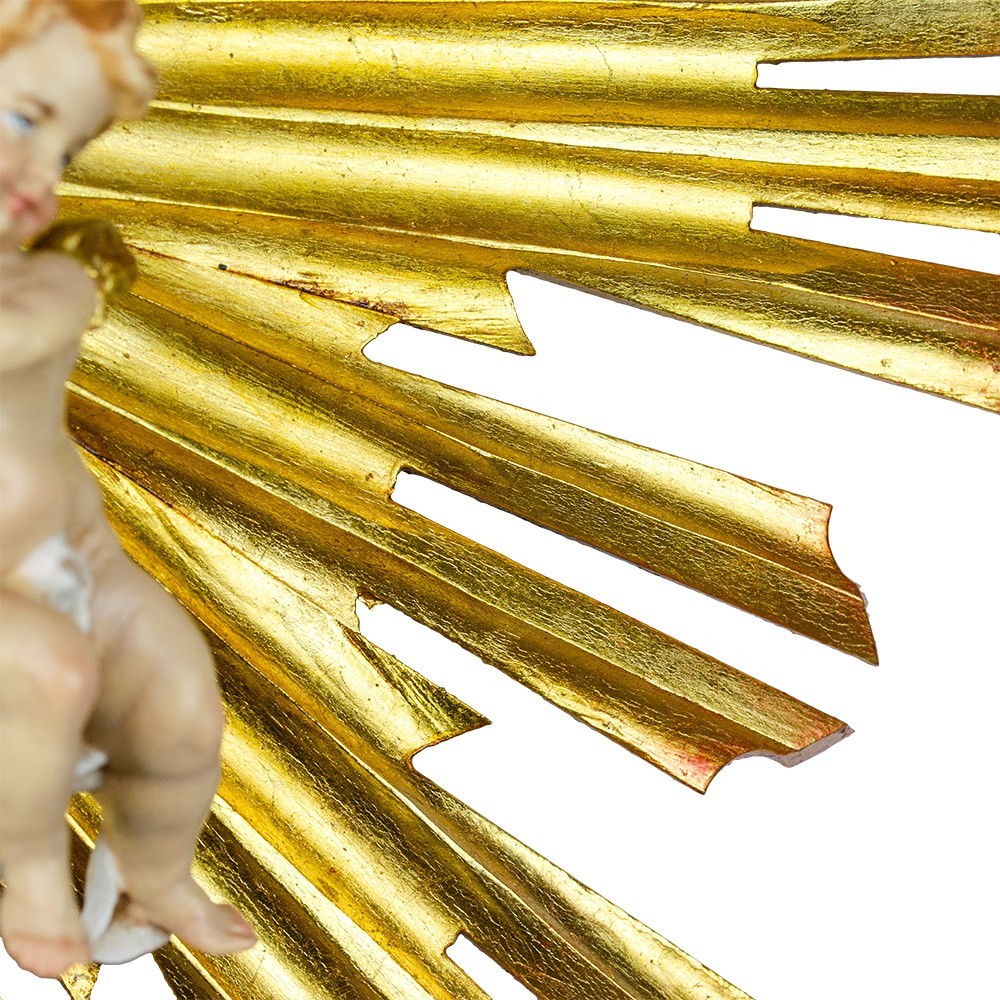 Gloriosa con Raggiera, articolo realizzato interamente in legno, dipinto a mano con colori ad olio e impreziosito da una splendida raggiera color oro.