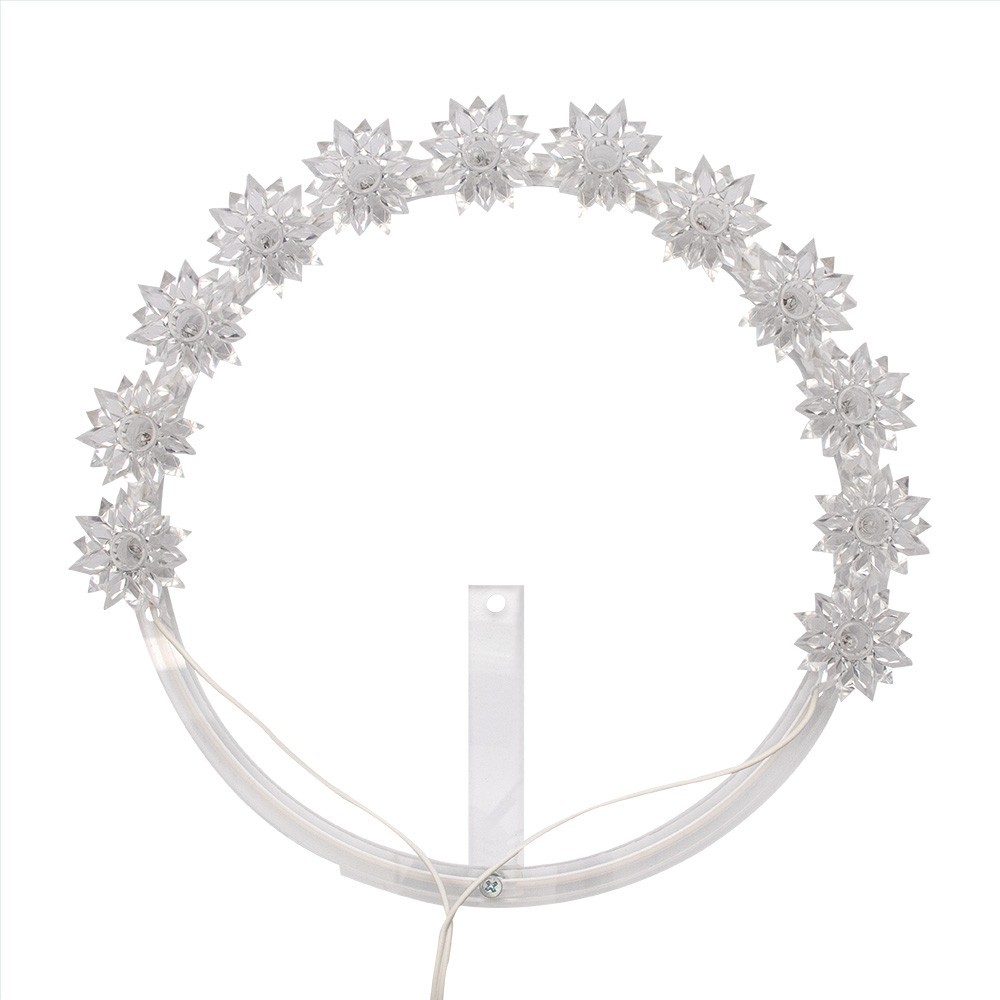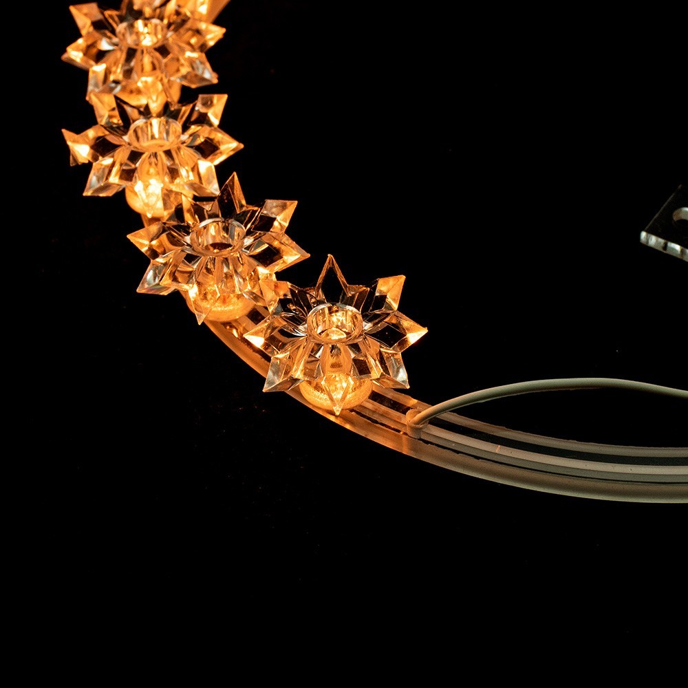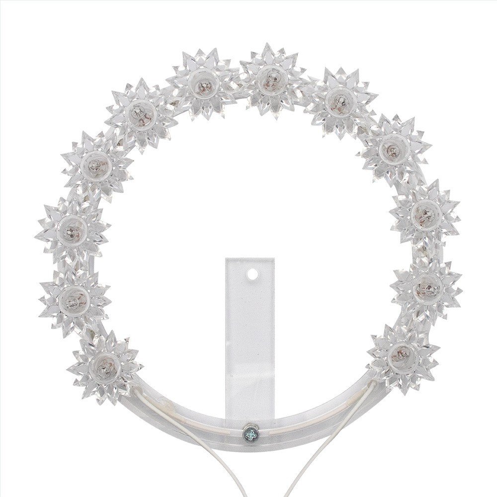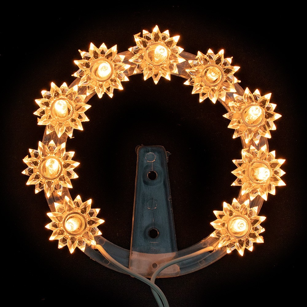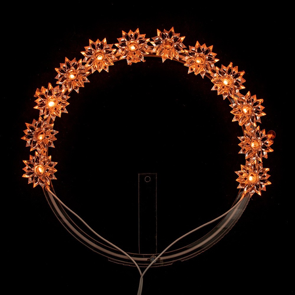 Stellario luminoso in plexiglass trasparente. Questa aureola per statue sacre è a forma circolare con 12 stelle applicate in base alla grandezza del diametro. Realizzata con luce gialla e funzionante direttamente a corrente elettrica. Corredato di scatola bianca.