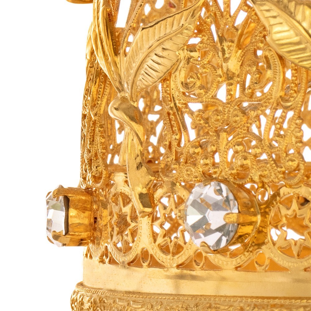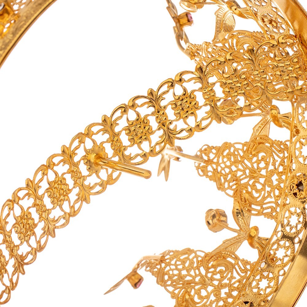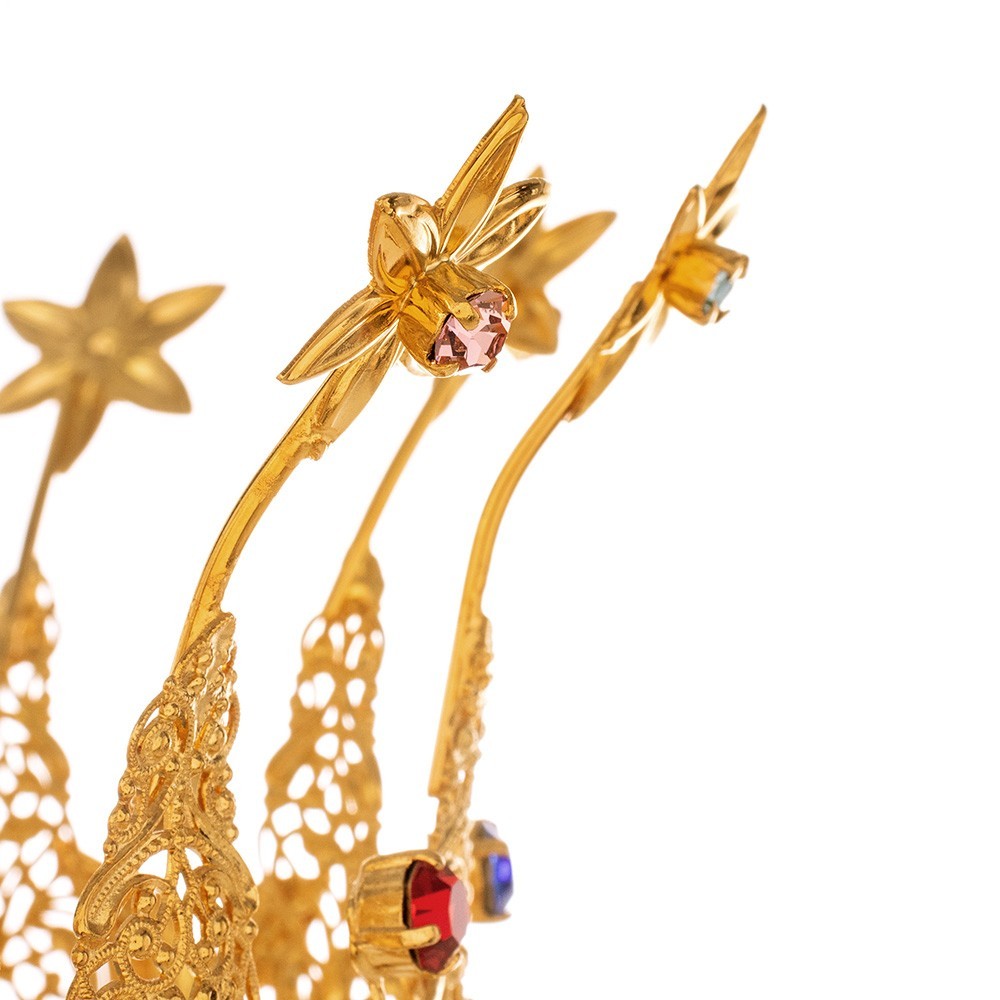 Corona in ottone per statua religiosa. La coroncina è realizzata in ottone dorato, arricchita con brillanti in vetro diamantato (dorate 24k). Molto elegante e raffinata, adatta per ornare qualunque tipo di statua con diametro Ø 15 cm - h 11 cm. Si tratta di lavorazione artigianale in filigrana dorata.