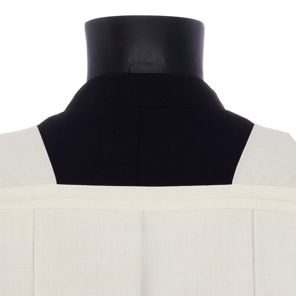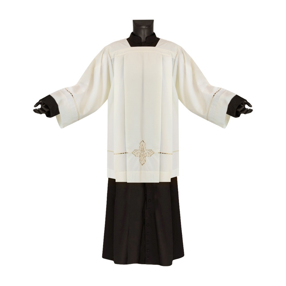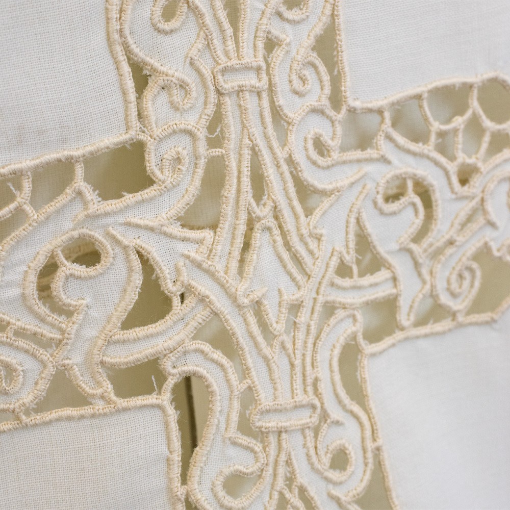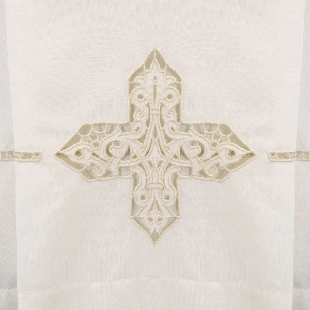 Realizzata con collo quadrato e ricamata finemente con intaglio a mano, presente sia in fondo alla cotta che attorno alle maniche.