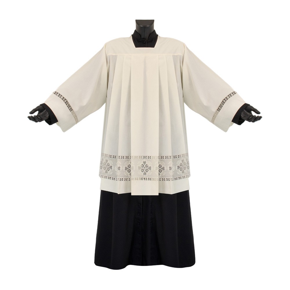 Cotta sacerdotale color avorio con piegoni e inserto in macramè.