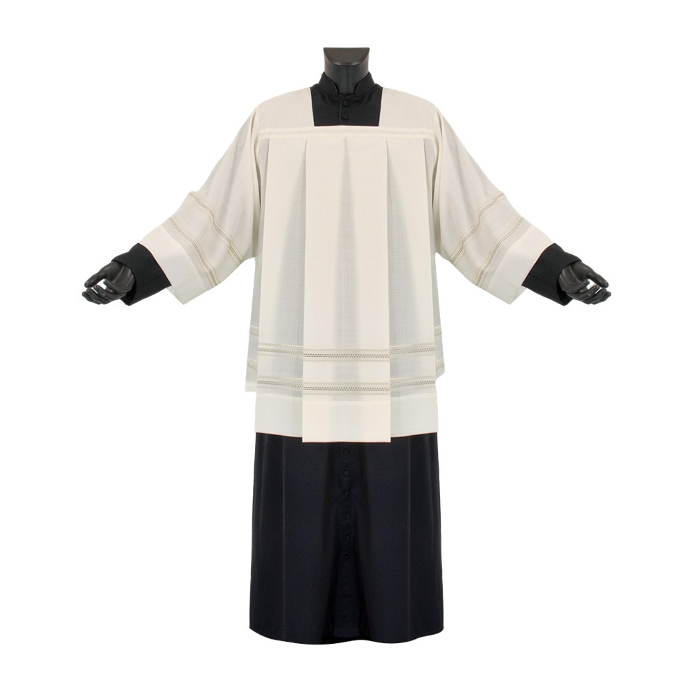 La cotta è realizzata in leggerissimo tessuto misto 55% poliestere e 45% lana. Il fine ricamo grigio è presente su due file nel fondo della cotta e delle maniche.