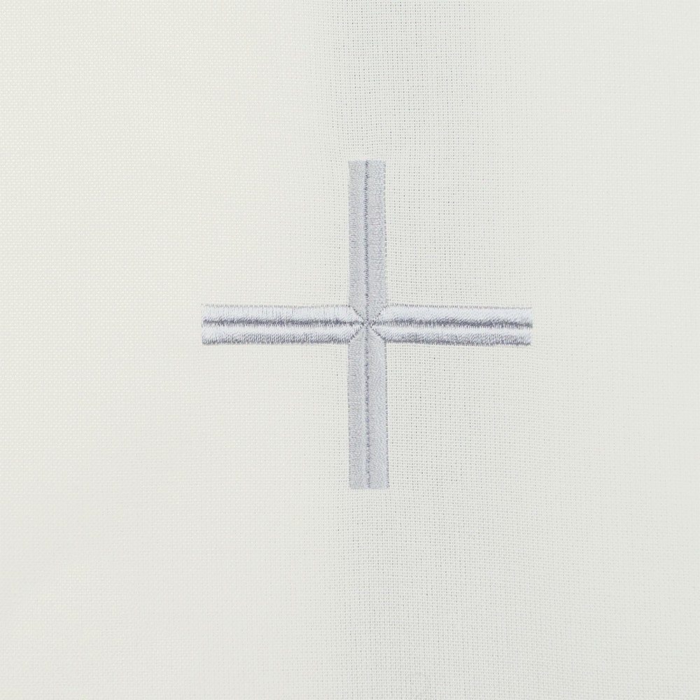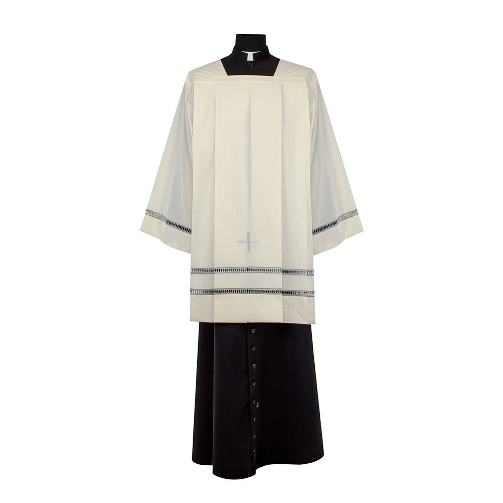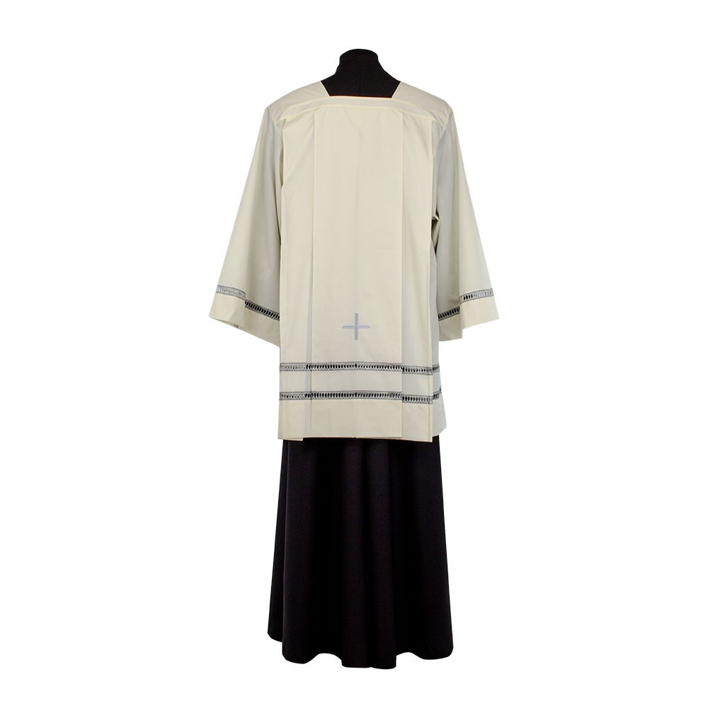 Cotta color avorio con due tramezzi gigliuccio di colore grigio e croce ricamati a macchina. La cotta è realizzata in leggerissimo cotone terital. Il ricamo grigio è presente su due file nel fondo della cotta e una fila nelle maniche. Articolo realizzato interamente da un'azienda italiana, garantendo tessuti di ottima qualità e lavorazione.