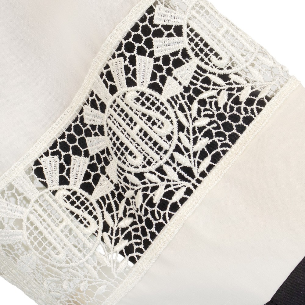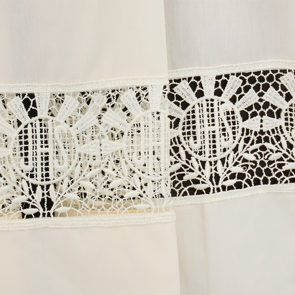 Realizzato in tessuto cotone e poliestere. Questo paramento sacro si apprezza per il suo delicato e elegante tramezzo in macramè presente sia sulla parte bassa che su entrambe le maniche. Ottima la vestibilità.