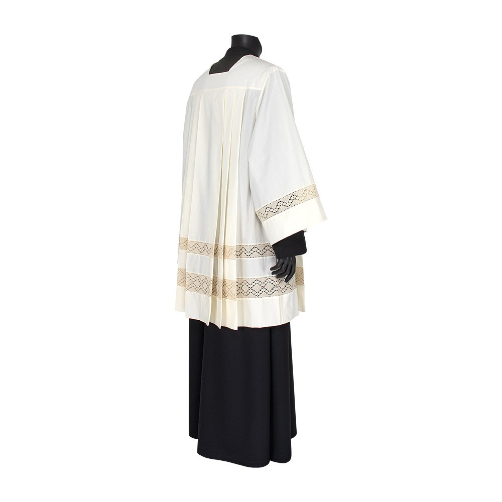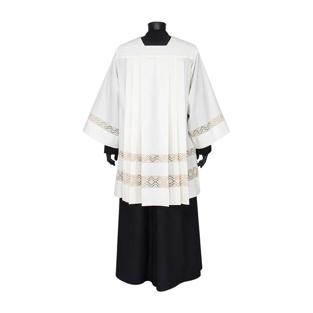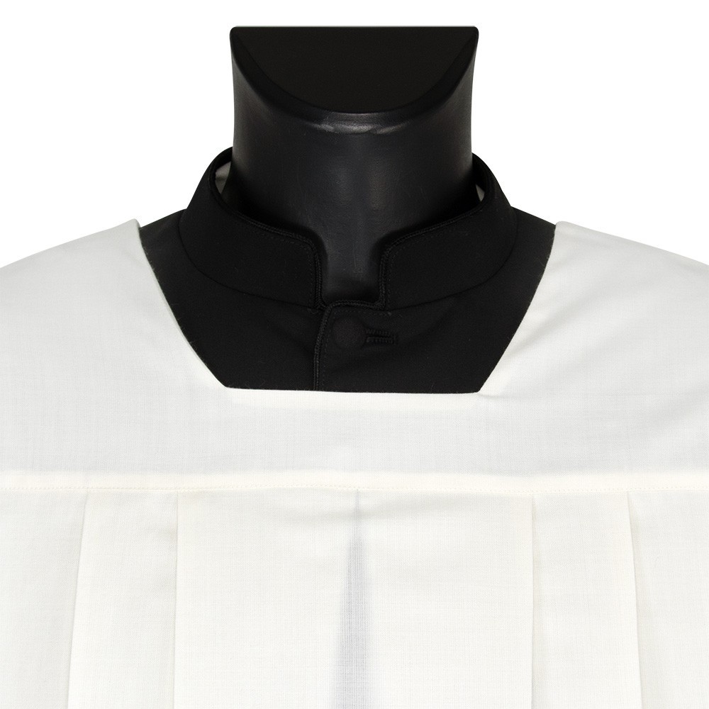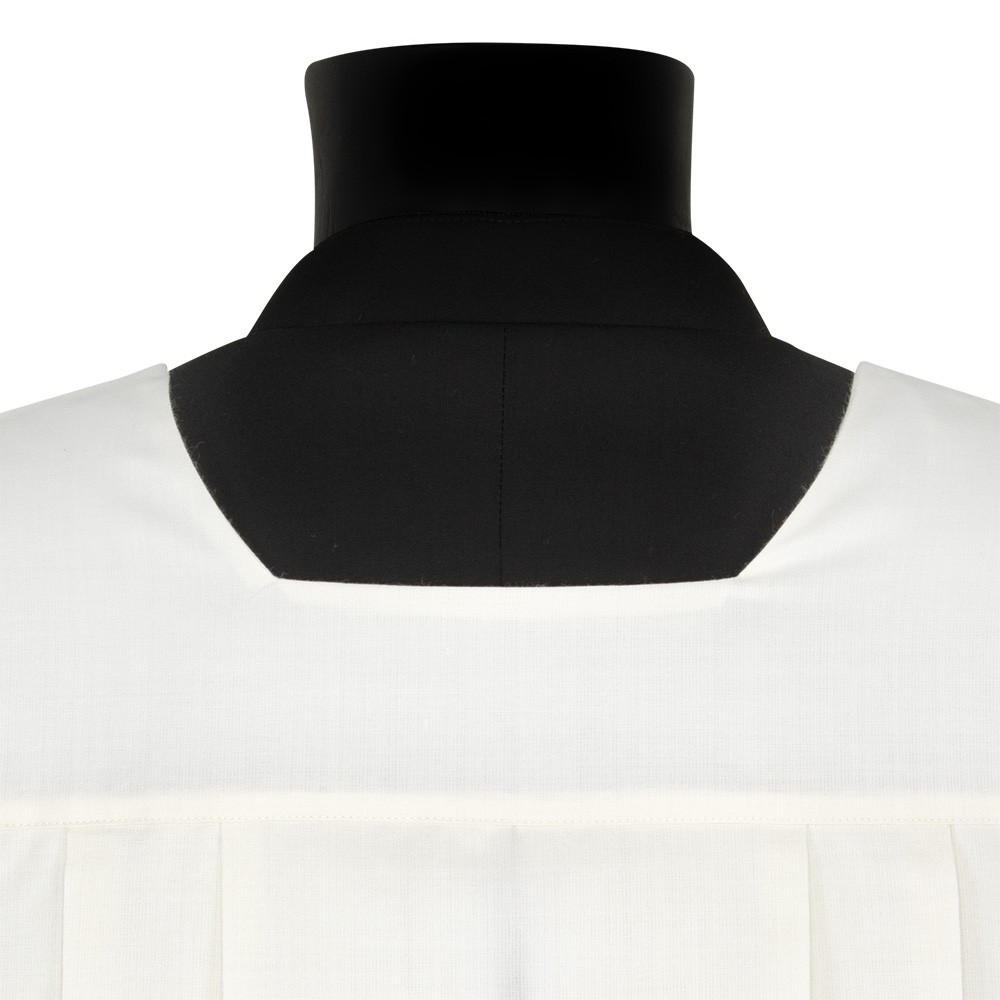 Cotta in misto cotone (50% Cotone e 50% Poliestere) per seminaristi, diaconi e sacerdoti. Questa veste liturgica è realizzata con tramezzo in puro cotone, con classico collo quadro e con piegoni. Prodotto 100% italiano.