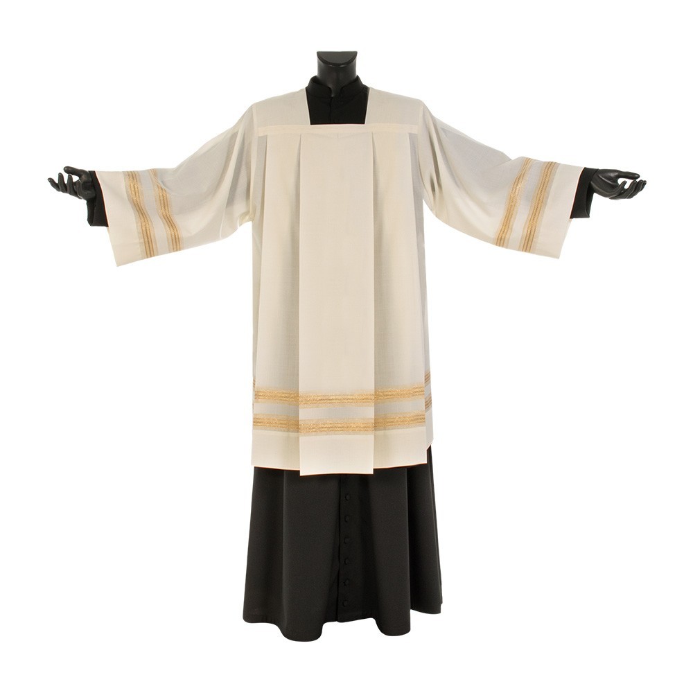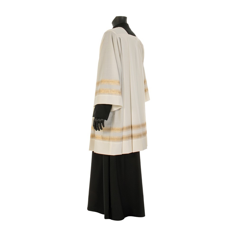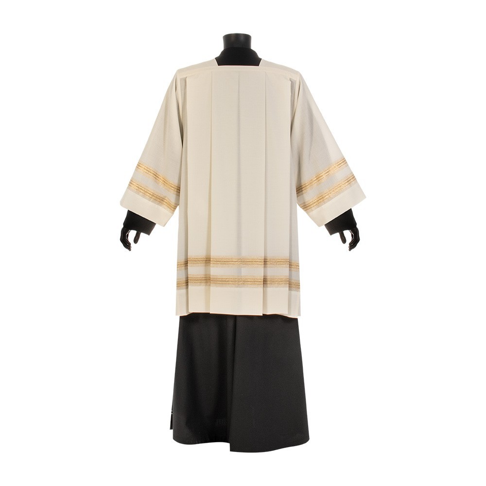 Cotta rigata color avorio per sacerdote. La cotta è realizzata in leggerissimo tessuto misto 55% poliestere e 45% lana. Il ricamo grigio è presente su due file nel fondo della cotta e una fila nelle maniche. Articolo realizzato interamente da un'azienda italiana, garantendo tessuti di ottima qualità e lavorazione.
