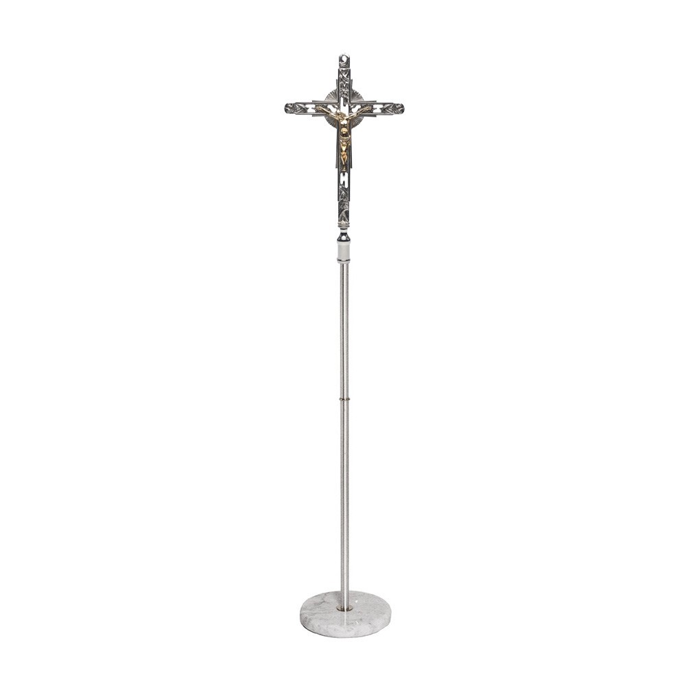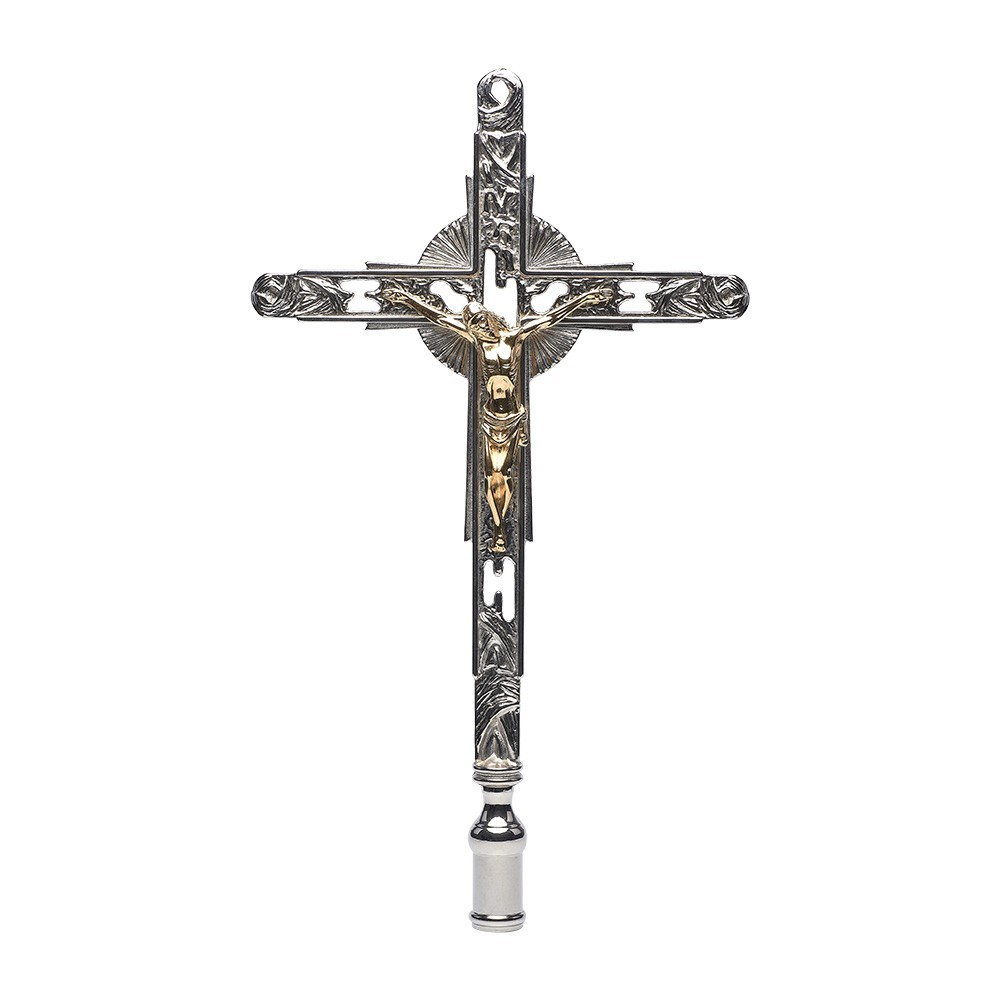Croce astile da innesto in stile moderno, realizzata in ottone bicolore con finitura oro e argento. La croce è adatta per potervi inserire il bastone di diametro massimo 3,2 cm (non incluso). Articolo di ottima qualità, 100% italiano.
