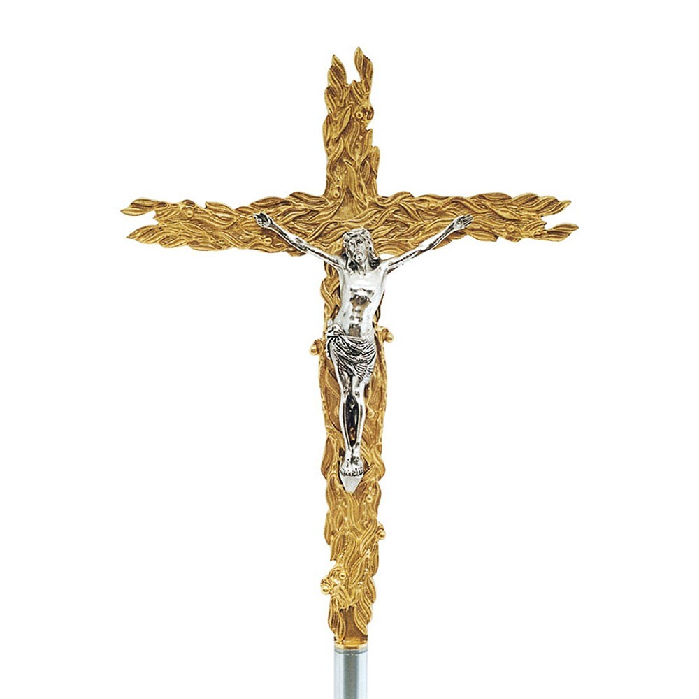Questa croce astile è un arredo sacro per la Chiesa ideale nelle processioni. La croce astile è in fusione di ottone, ornata da un decoro in riievo. L'asta è alta 150 cm ed è smontabile in due pezzi da 75 cm.