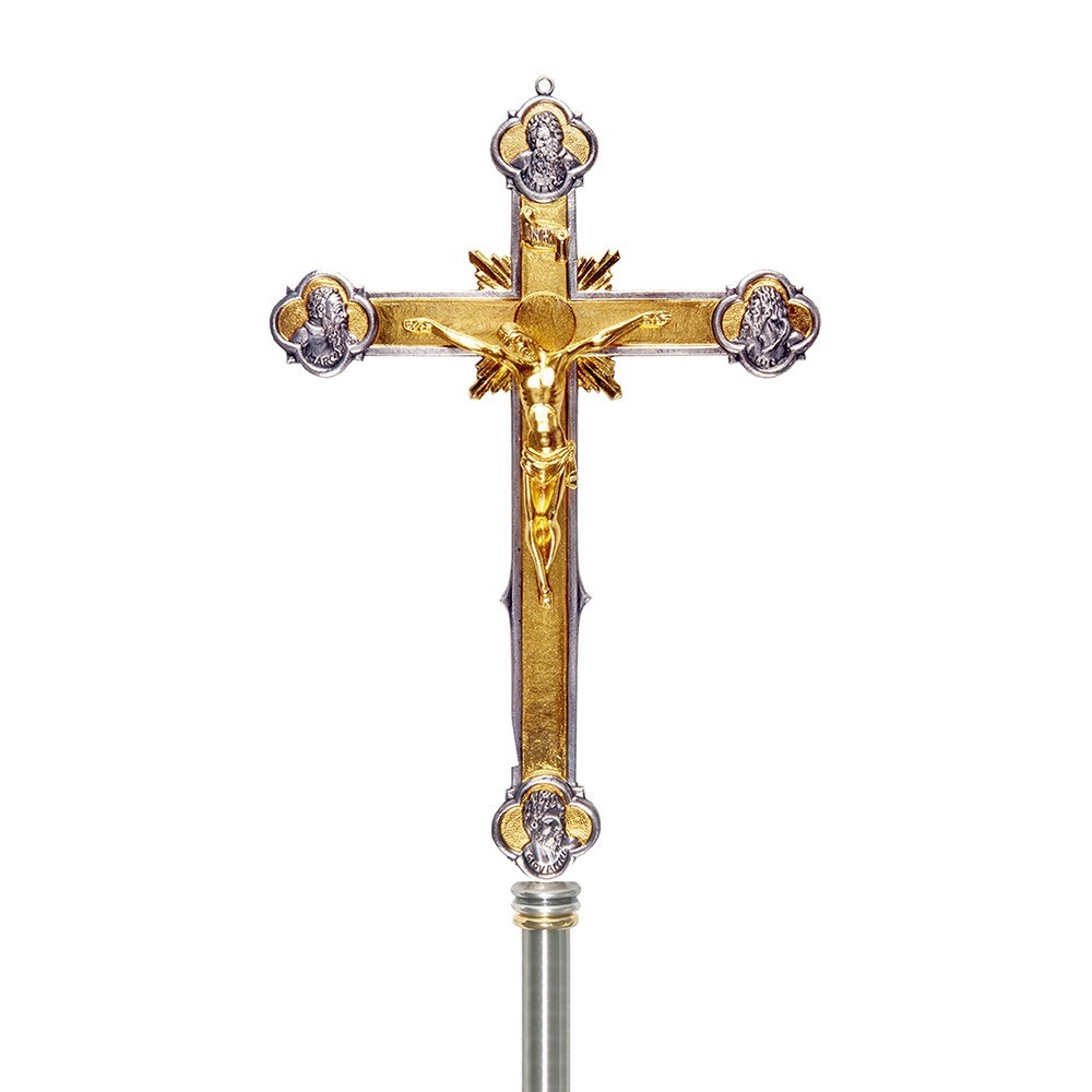 Croce astile in ottone dorata. Sulla croce sono raffigurati i simboli dei quattro Evangelisti. L'asta è alta 150 cm è smontabile in due pezzi da 75 cm. Ideale nelle processioni sia all'interno della Chiesa, che all'esterno nelle via della città. Asta smontabile in due pezzi.