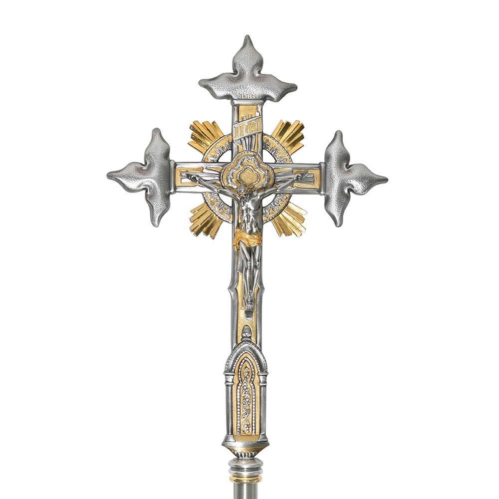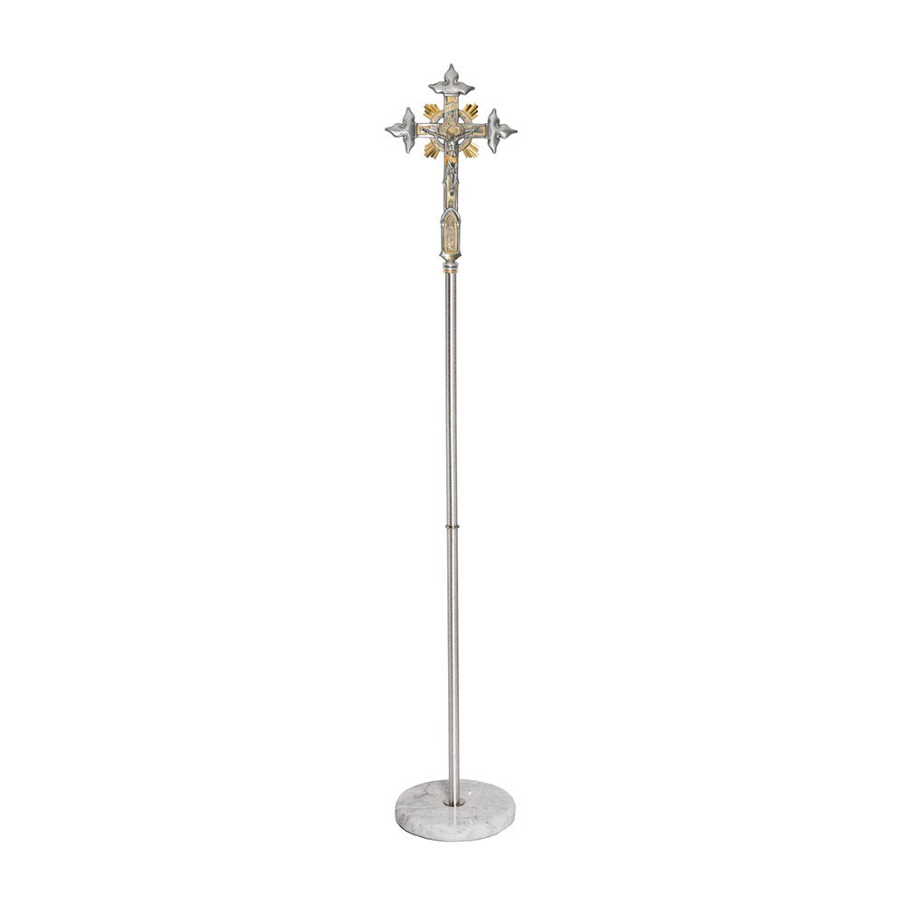 Croce astile in ottone bicolore con finitura oro e argento. Completa di raggiera. L'asta è alta 150 cm è smontabile in due pezzi da 75 cm. Ideale nelle processioni sia all'interno della Chiesa, che all'esterno nelle via della città.