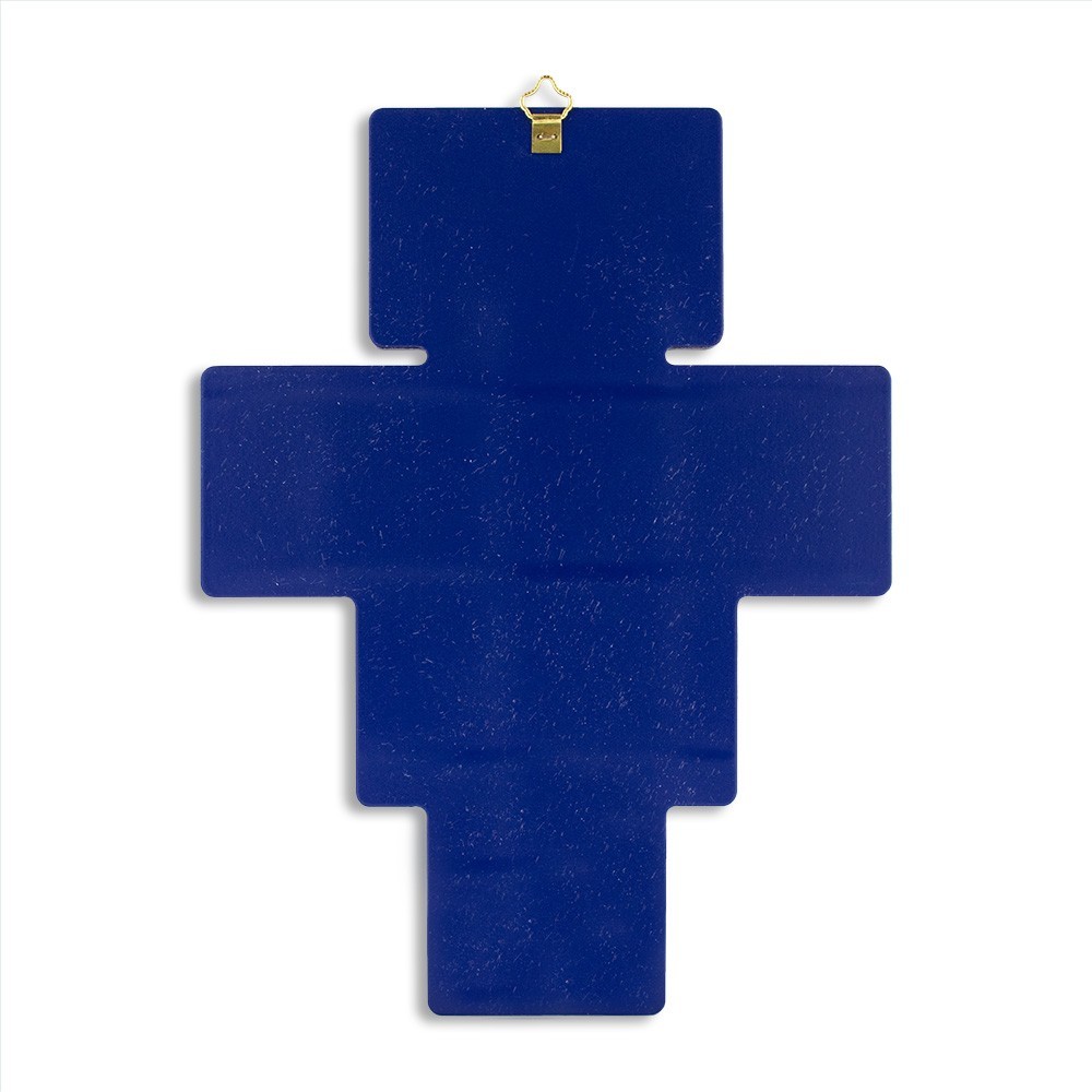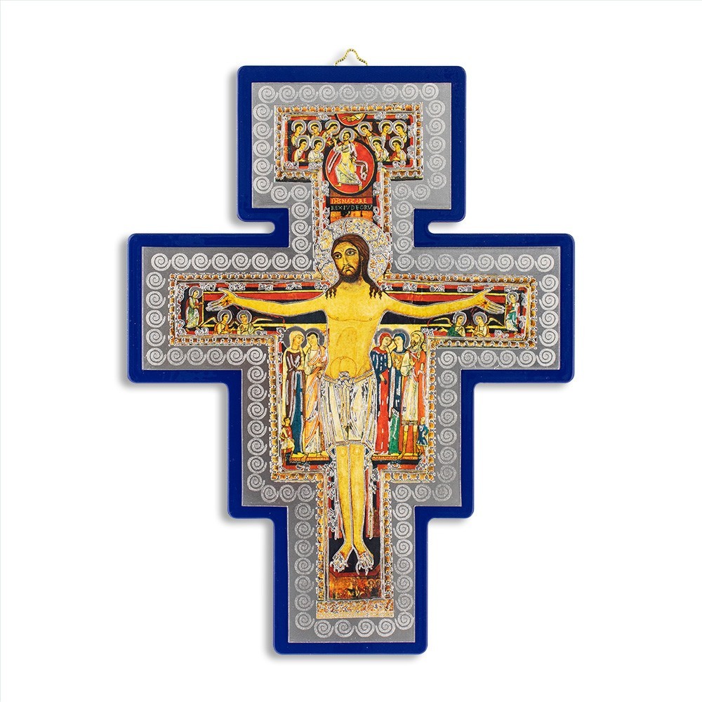 La croce di San Damiano è realizzata in argento colorato e sul retro è laccata di colore blu. Corredata di triangolino in metallo color oro e confezionata in scatola di plastica trasparente. Produzione 100% italiana.