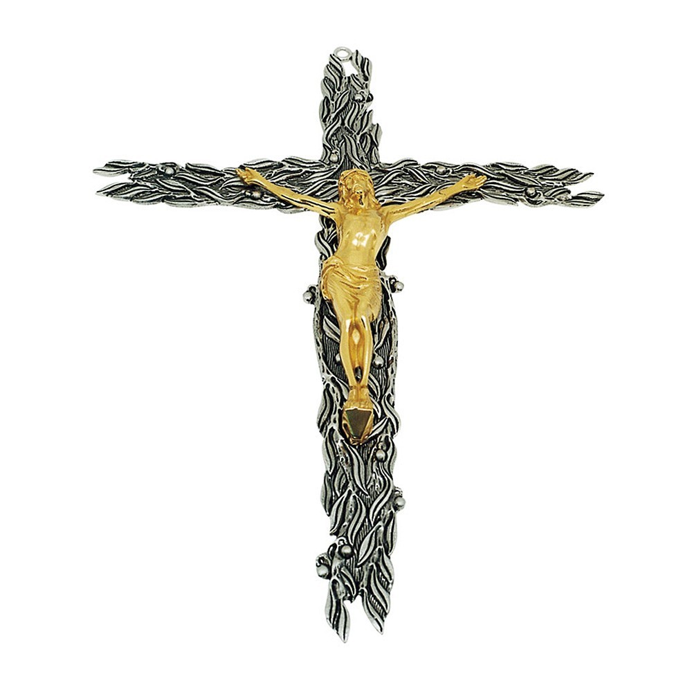 Crocifsso da parete (22x32 cm), arredo sacro per la chiesa, realizzato in fusione di ottone. La croce è finemente decorata con rami di ulivo. Articolo di alta qualità, lavorato e rifinito interamente a mano.