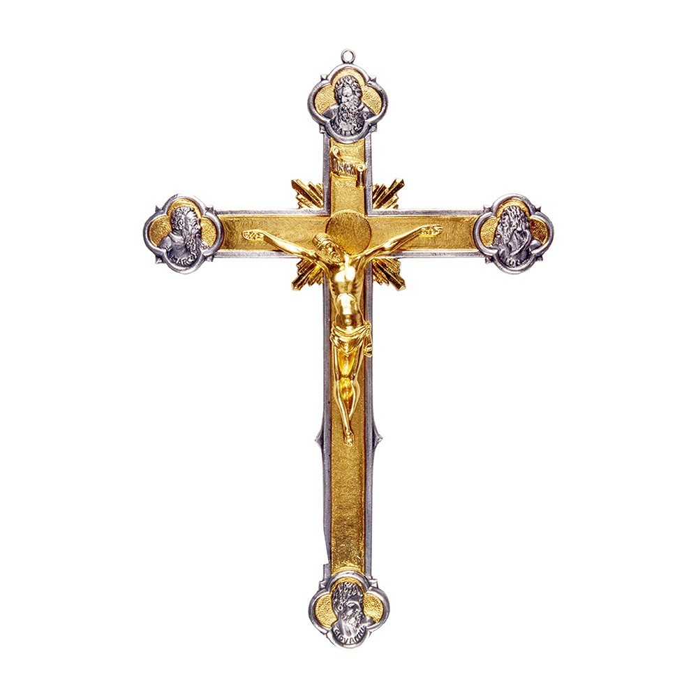 Il crocifisso è prodotto interamente in bronzo dorato. Sul Crocifisso sono applicati in rileivo il Corpo di gesù Cristo e i simboli dei quattro Evangelisti. Articolo di grande pregio, esegutio da esperti artigiani italiani.