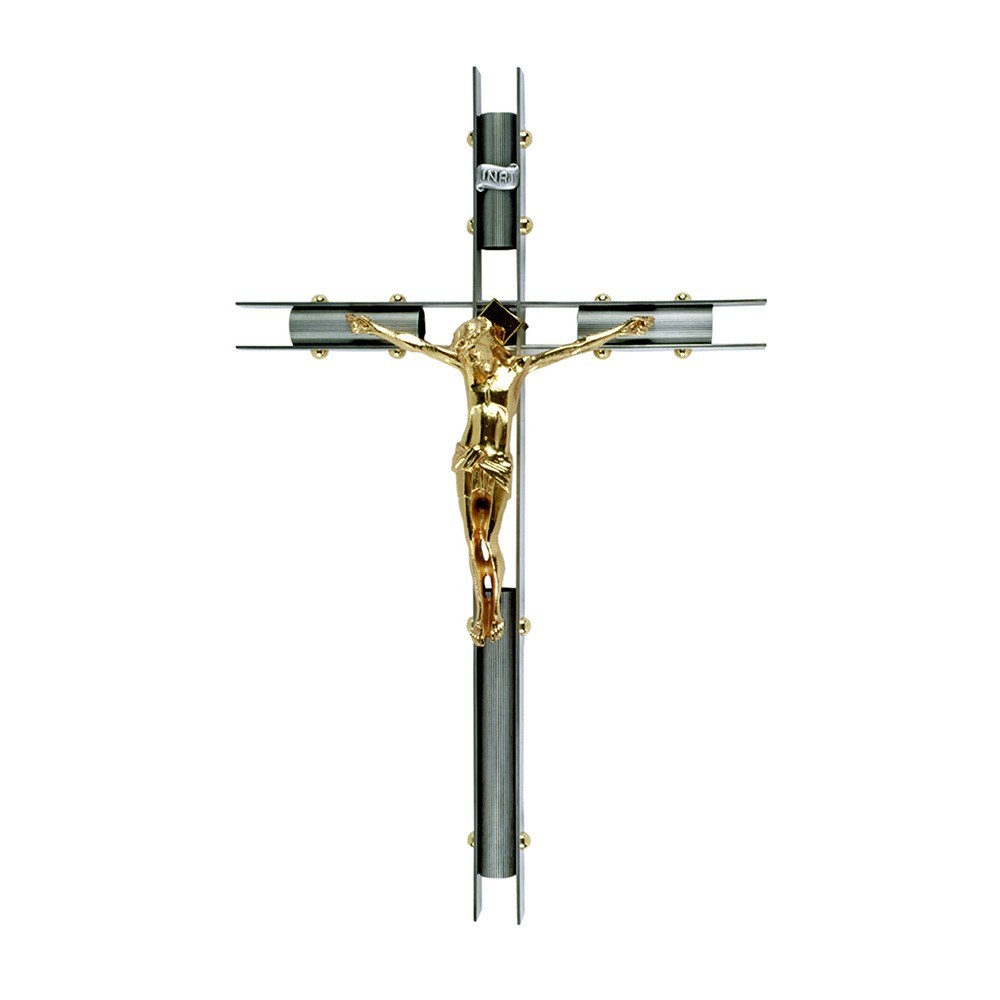 Croce moderna da parete in ottone bicolore, con finitura oro e aragento. Il crocifisso è alto 65 cm ed è largo 40 cm. Articolo di ottima fattura eseguito interamente da un'azienda italiana.