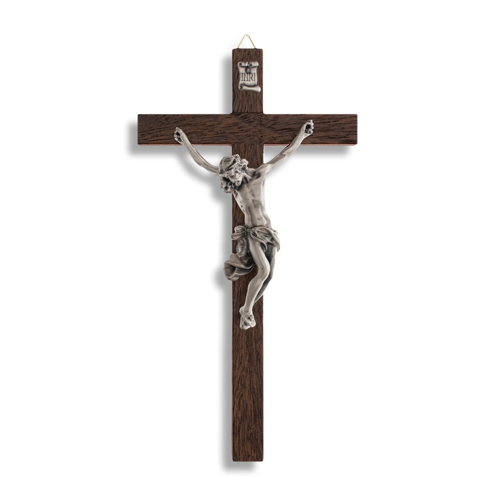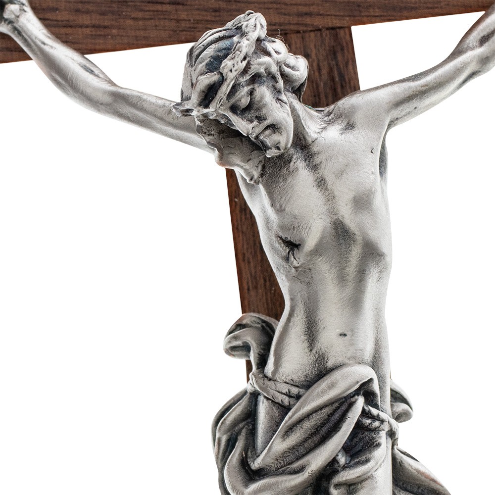 Il Corpo di Cristo e la scritta INRI sono realizzati in metallo argentato. Vien fornito completo di scatola in cartoncino bianco e libretto con informazioni sul significato della Croce.