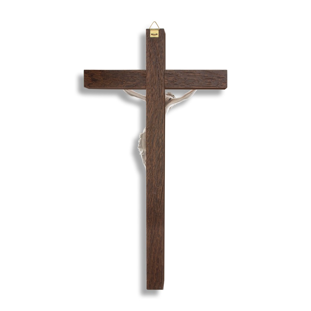 Croce da parete in legno di mogano con gancio in metallo.