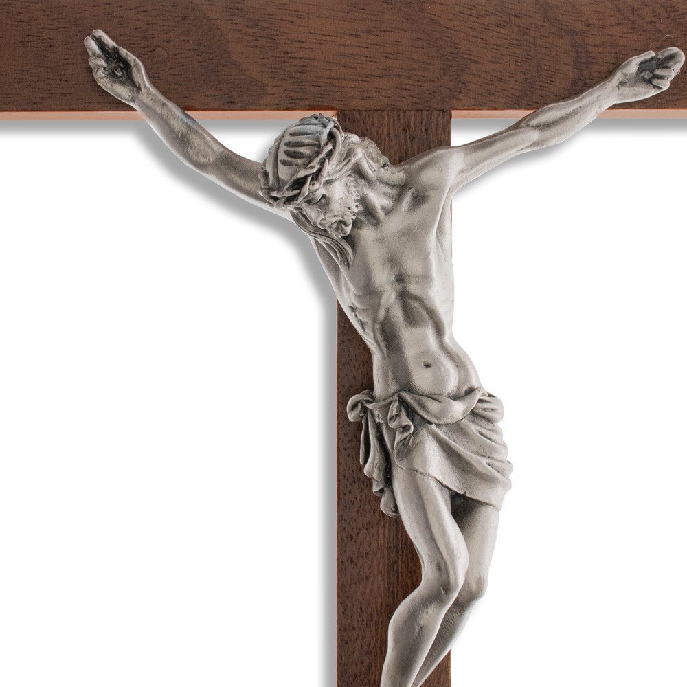 Crocìfisso da parete in legno mogano liscio e Cristo in metallo.
