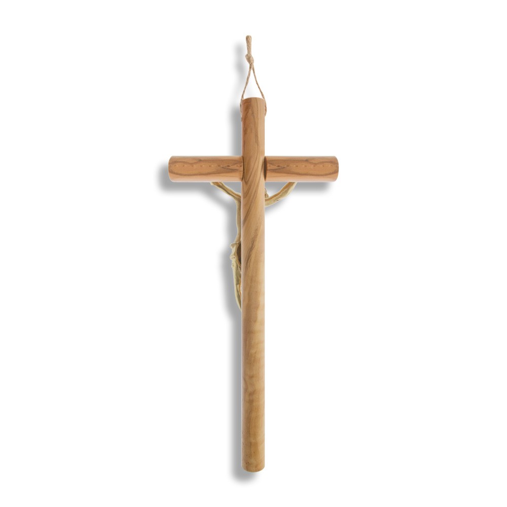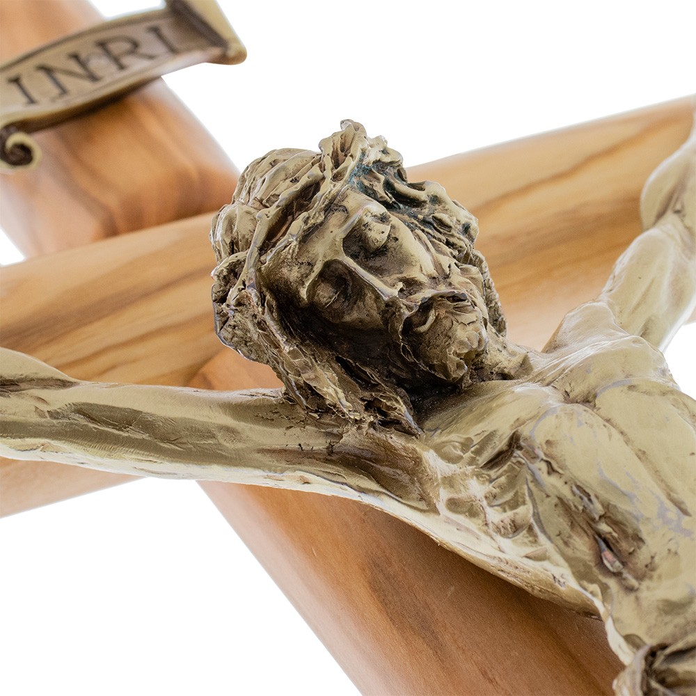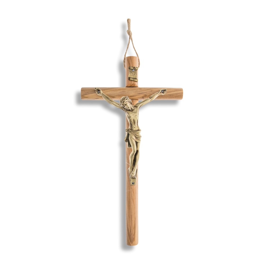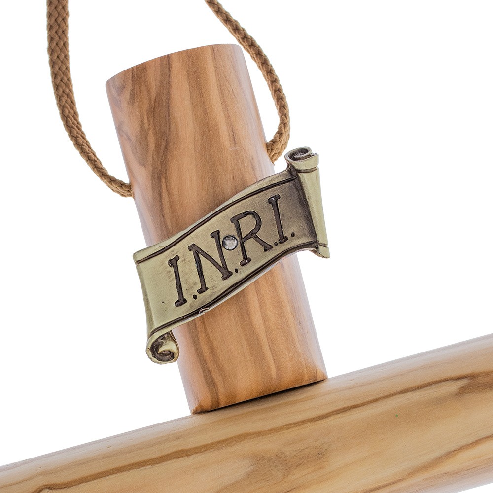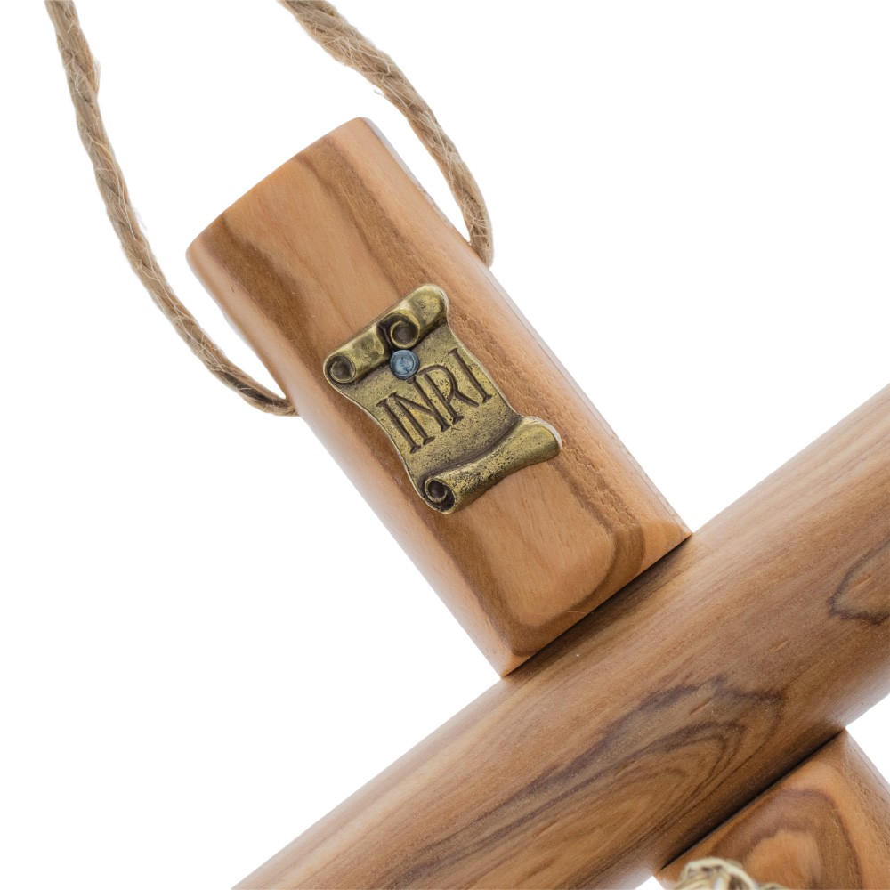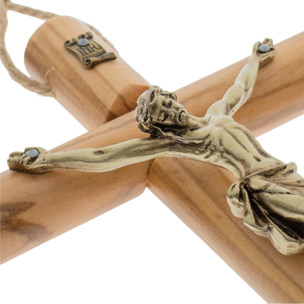 Crocifisso da parete in legno di ulivo con gancio in corda. Il Corpo di Cristo e la scritta INRI sono realizzati in metallo bronzo.