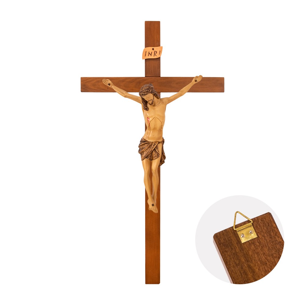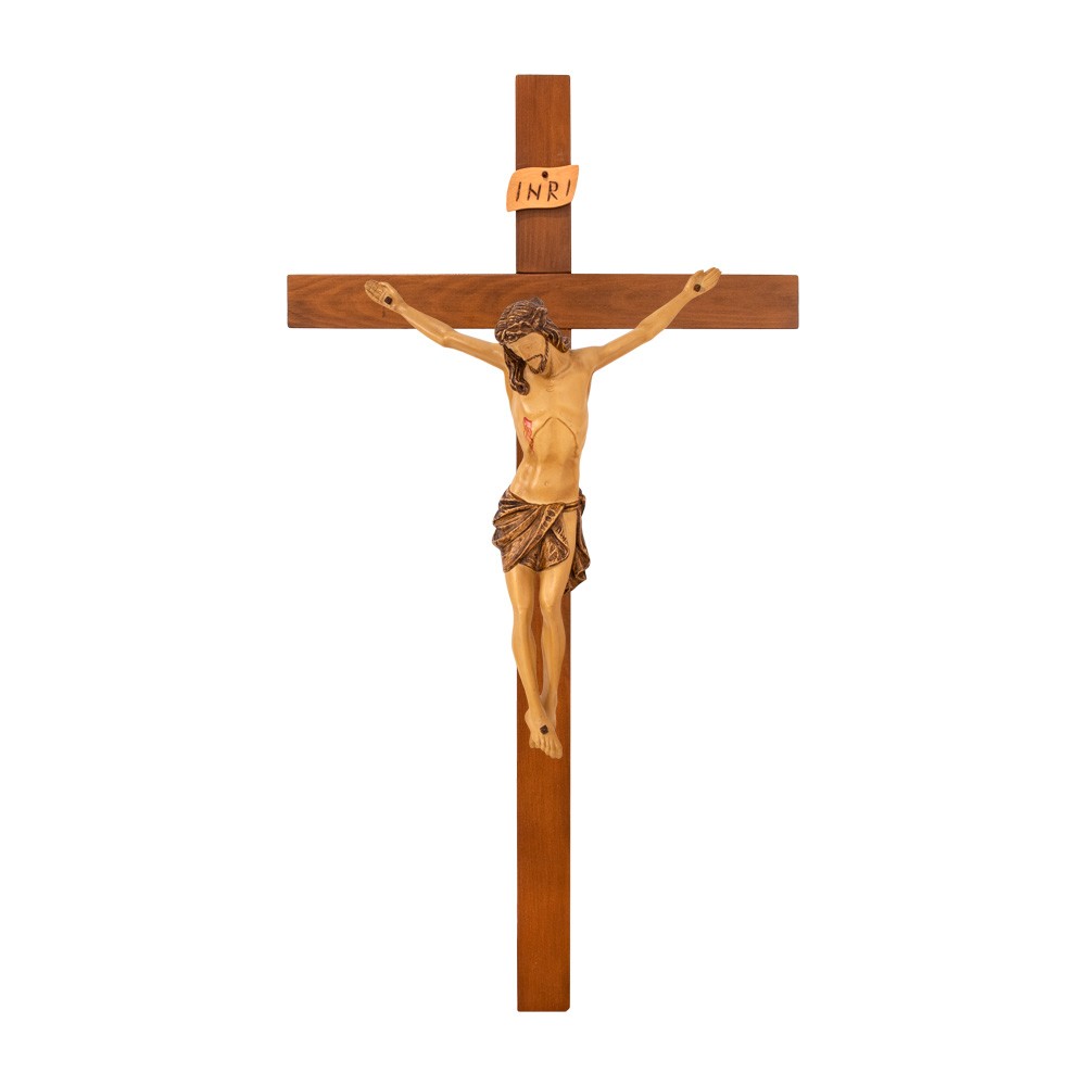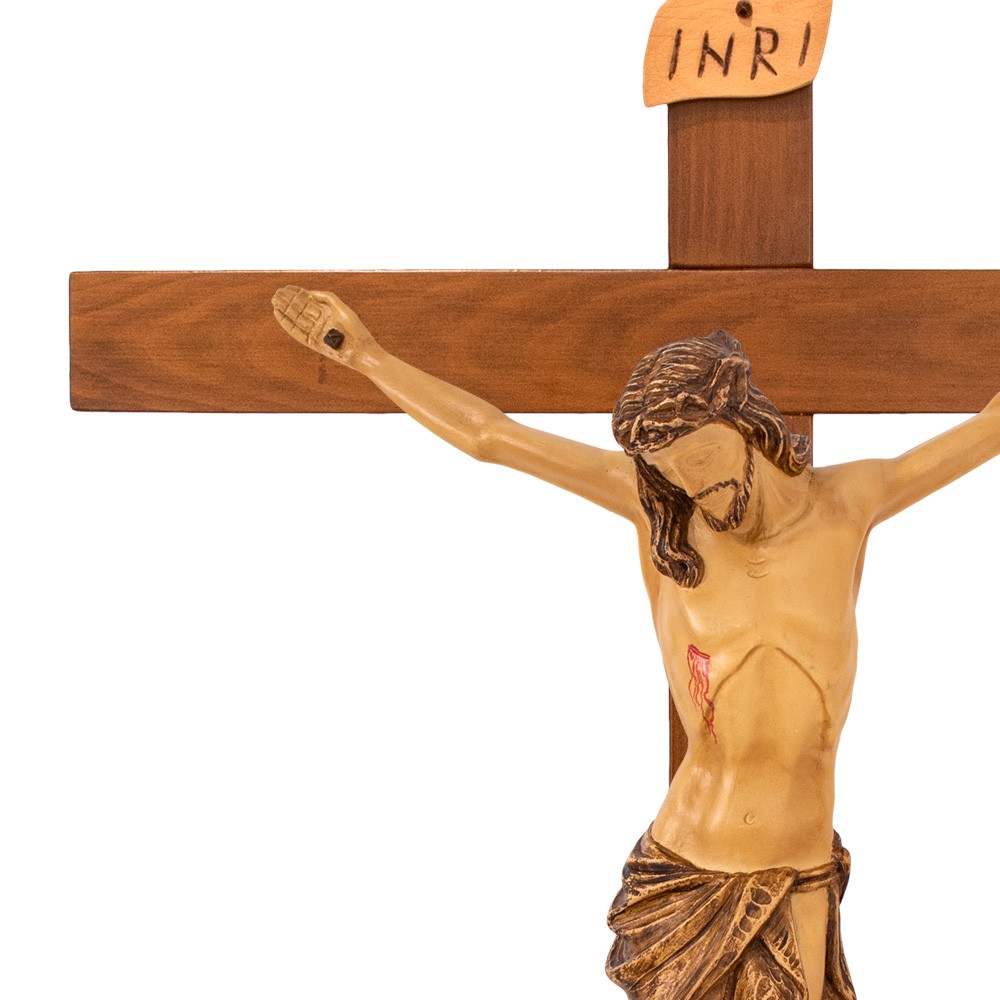 Questo crocifisso è realizzato interamente in legno, sia la croce che il Corpo di Cristo. Il corpo è scolpito e dipinto finemente a mano. Ideale anche per processioni perchè molto leggera. E' uno degli arredi sacri più richiesti, lavorazione artigianale di ottima qualità.