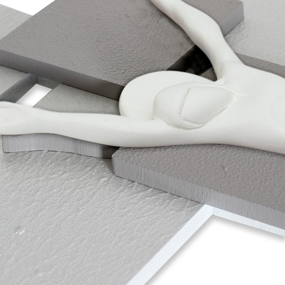 Crocifisso dal design moderno con fondo composto da più pannelli in fibra di legno e Cristo in marmorino bianco.