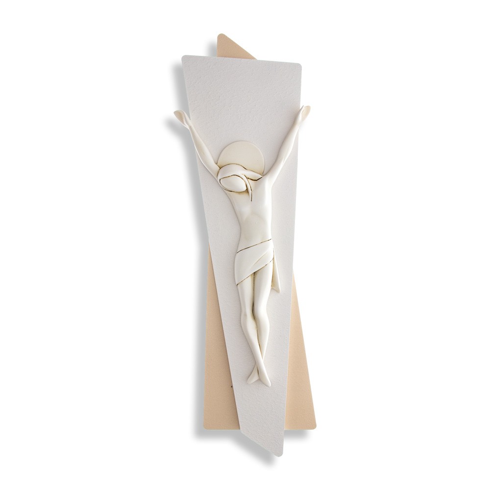 Crocifisso da parete realizzato su due pannelli stilizzati e sovrapposti con colori differenti.