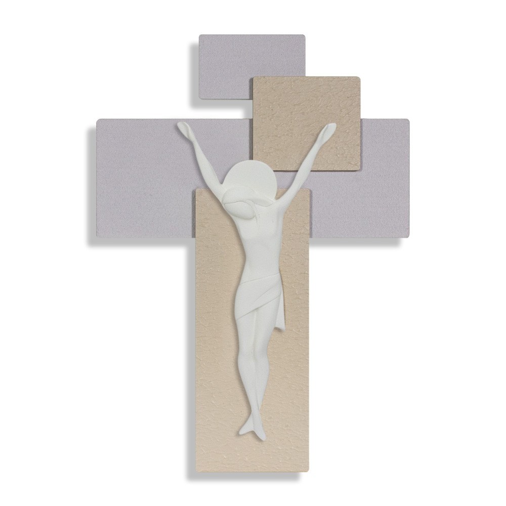 La croce è da parete con corpo di Gesù Cristo in marmorino bianco satinato, con fondo composto da più pannelli in fibra di legno colorata.