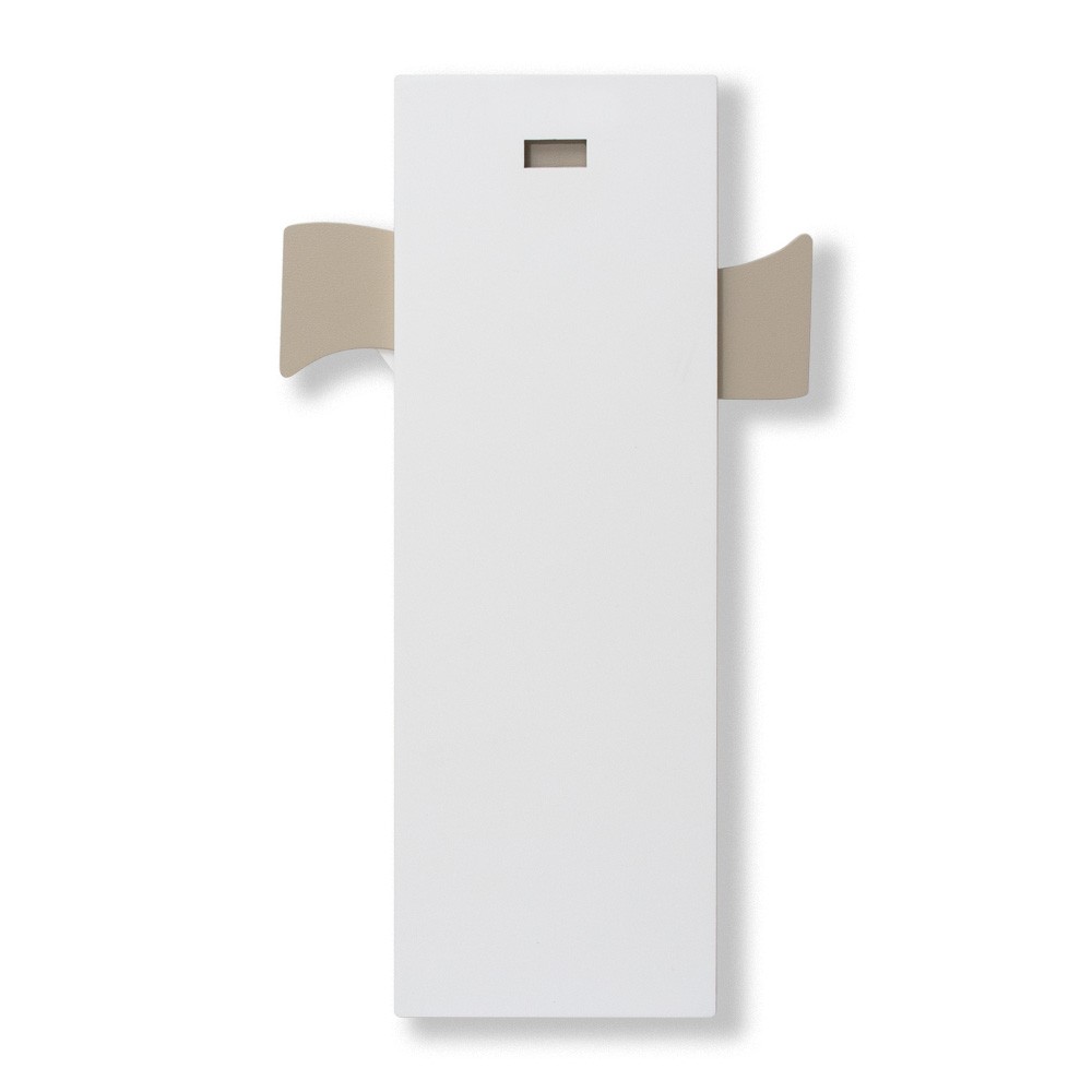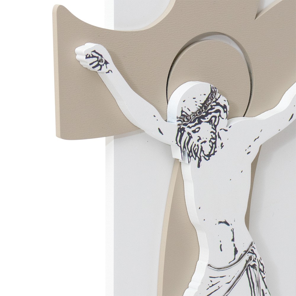 Il corpo di Cristo è sagomato ed è applicato su due pannelli in MDF color tortora e bianco, impreziosito con inserti in metallo argento lucido.