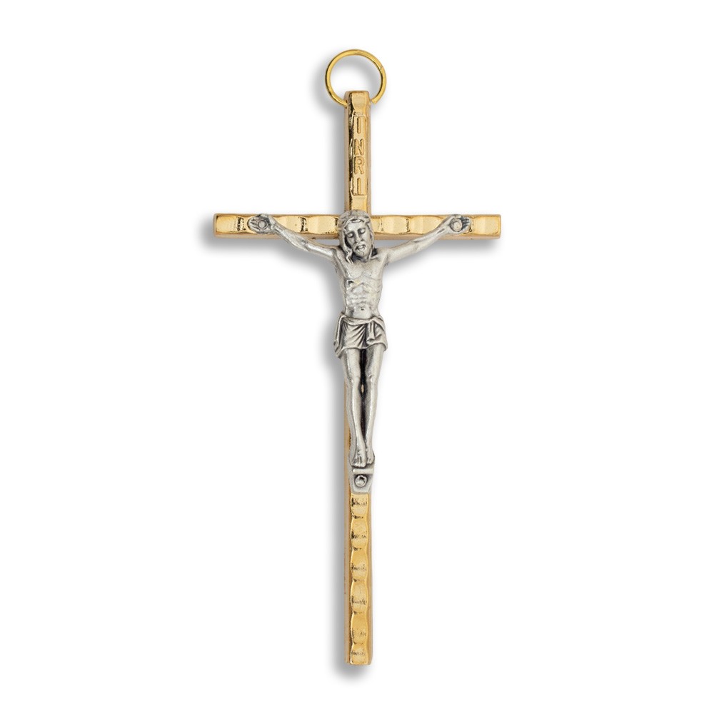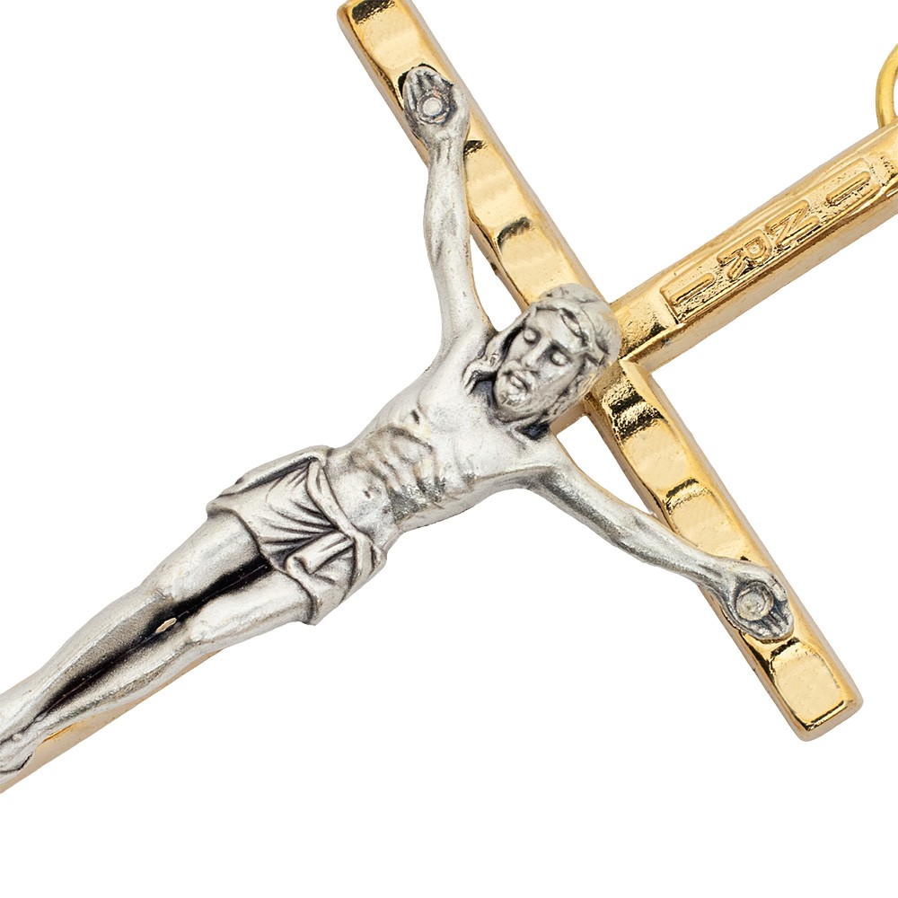 Mini crocifisso in metallo oro e argento, misura 11x5,5 cm.