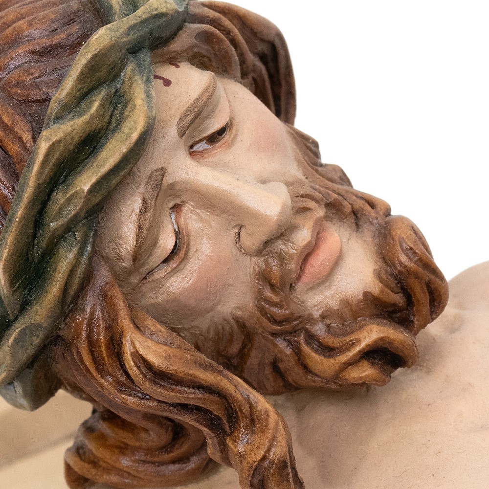 Questa particolare scultura è interamente in legno di tiglio scolpito con finitura colorata, realizzata manualmente da esperti artigiani della Val Gardena.