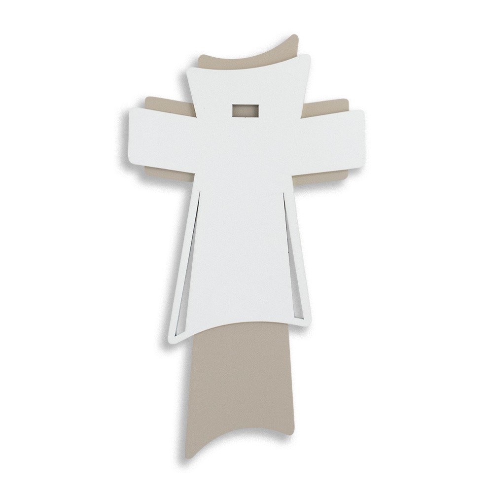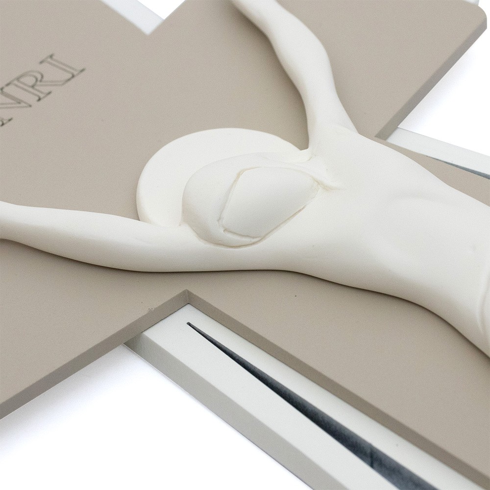 Elegante crocifisso da parete dallo stile contemporaneo composto da due pannelli sovrapposti uno bianco e uno tortora conferendo leggerezza ed eleganza al design. Il Copro di Cristo è in marmorino bianco satinato aggiunge un tocco di purezza e sacralità.