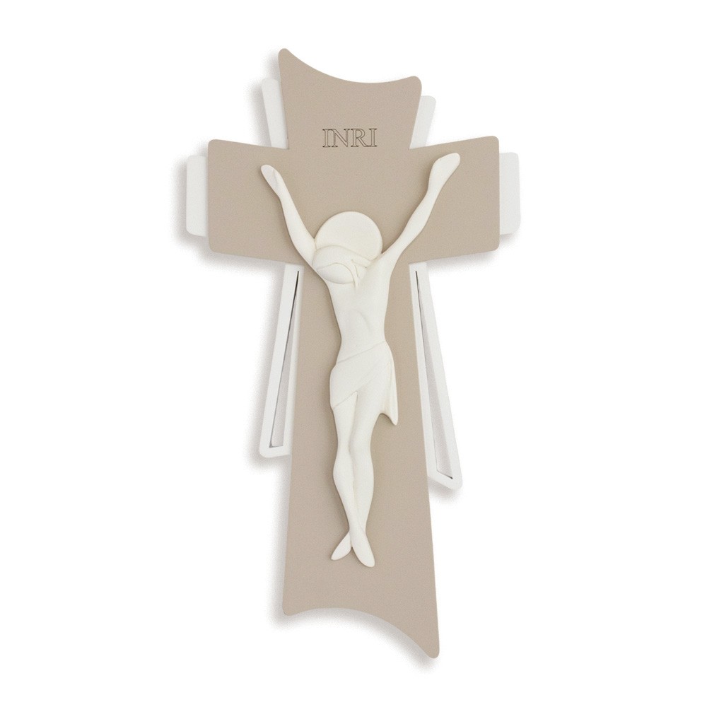 Questo meraviglioso crocifisso dal design moderno è composto da due pannelli colorati in legno MDF, con il Corpo di Cristo in marmorino bianco satinato.