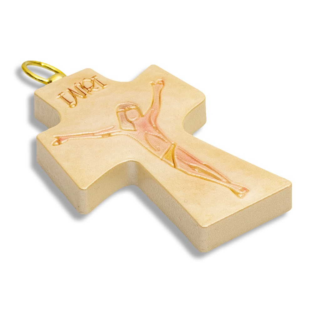 Croce da Collo (7 x 5 cm) realizzata in polimero effetto perlato, raffigurante il Corpo di Cristo. Prodotto made in Italy. Corredata di scatola in plastica trasparente.