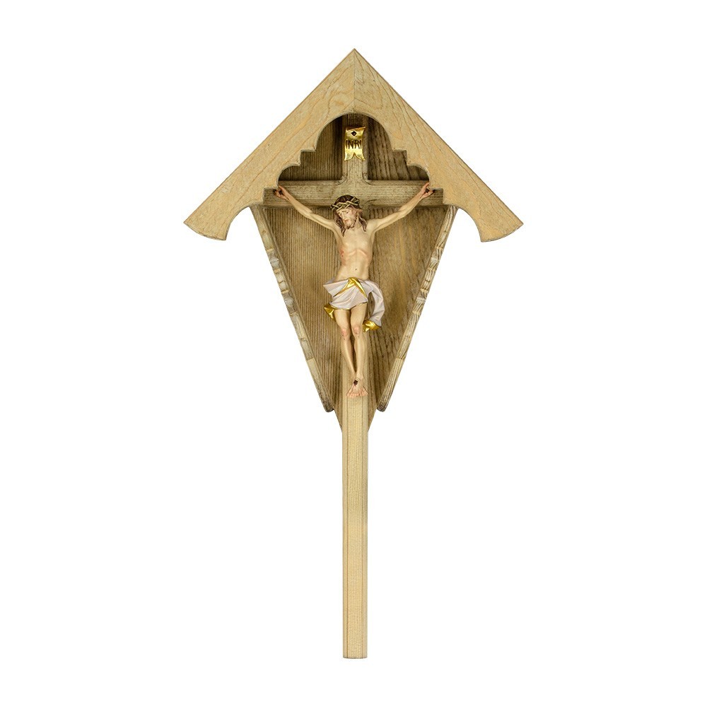 Croce da Campo detta anche "Croce di Campagna" in legno. Questa particolare croce è scolpita interamente a mano da esperti artigiani della Val Gardena. Dopo averla scolpita, il legno viene brunito è realizzato con una patina marrone chiara e lucidata a cera.
