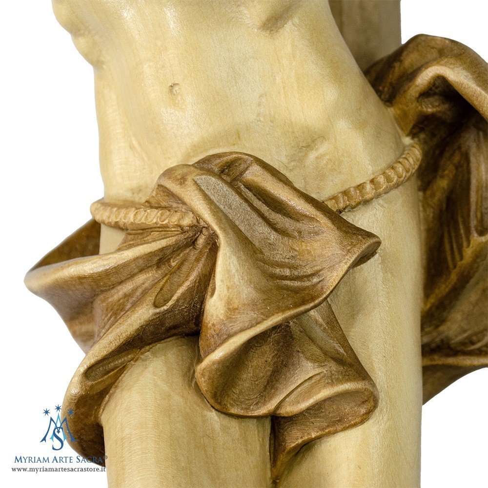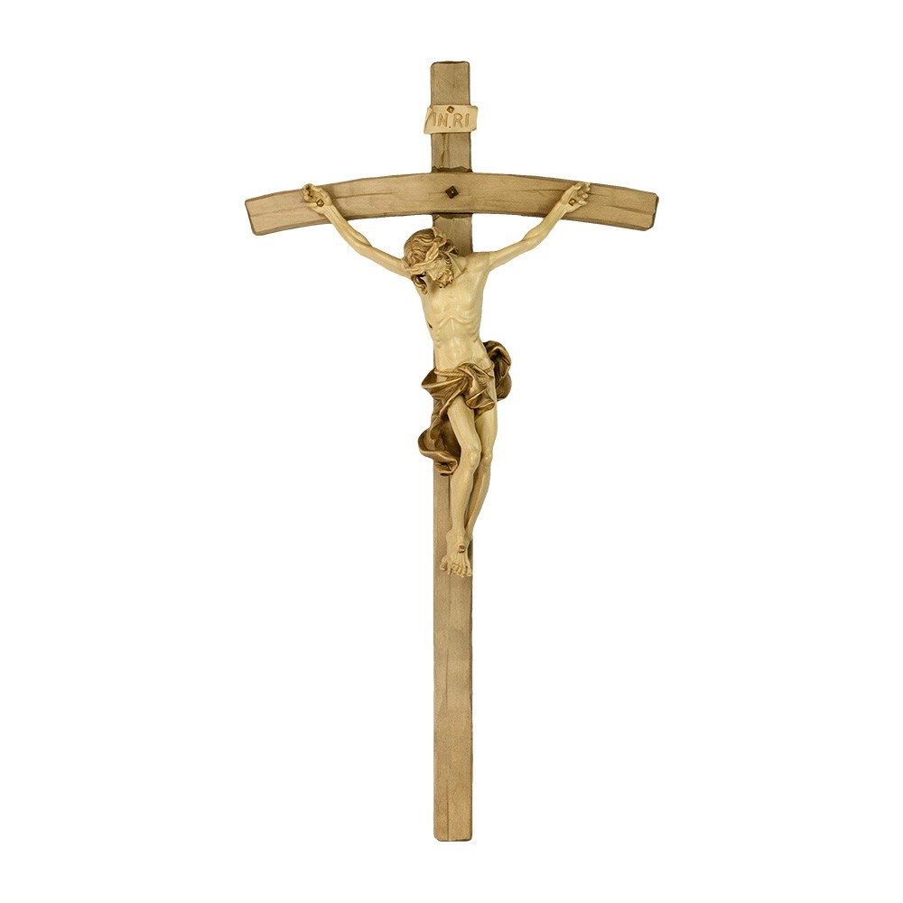 Corpo di Cristo Barocco su crocifisso curvo brunito. Il crocifisso con Cristo è interamente in legno brunito con una graduata patina marrone chiara e lucidato a cera. Il prodotto è realizzato artigianalmente con estrema cura da esperti artigiani della Val Gardena.