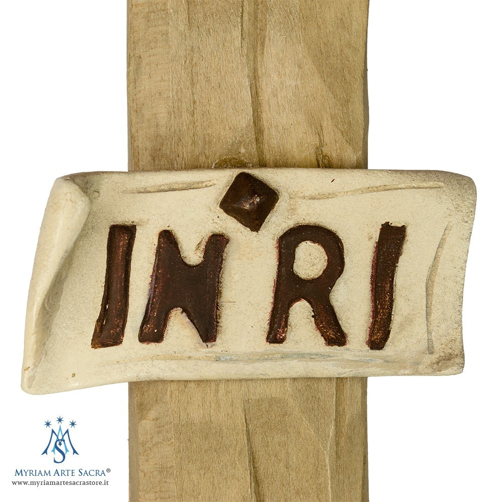 Croce tau in ceramica decorato.