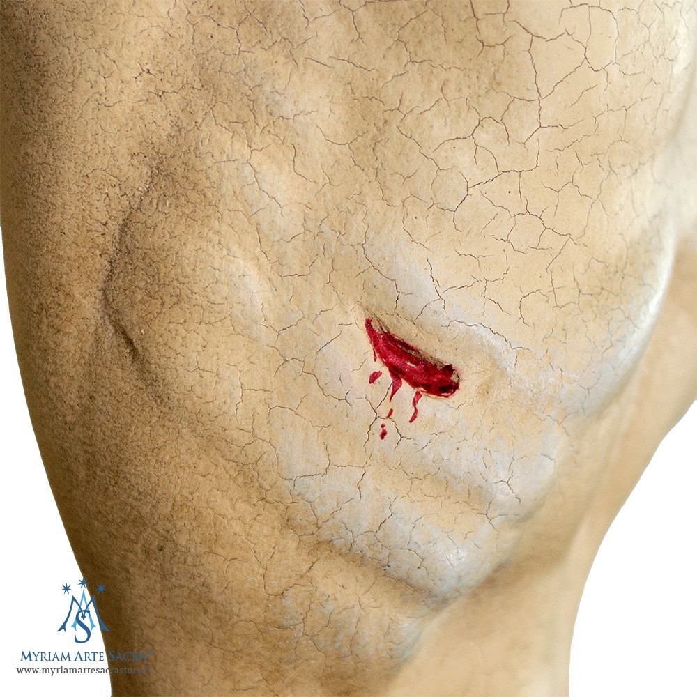 Cristo Barocco su croce semplice dritta. Il crocifisso con Corpo di Cristo stile barocco è interamente in legno con finitura antica con panno blu e oro. Pitturata in stile antico con colori ad olio e doratura con foglia oro ossidata.