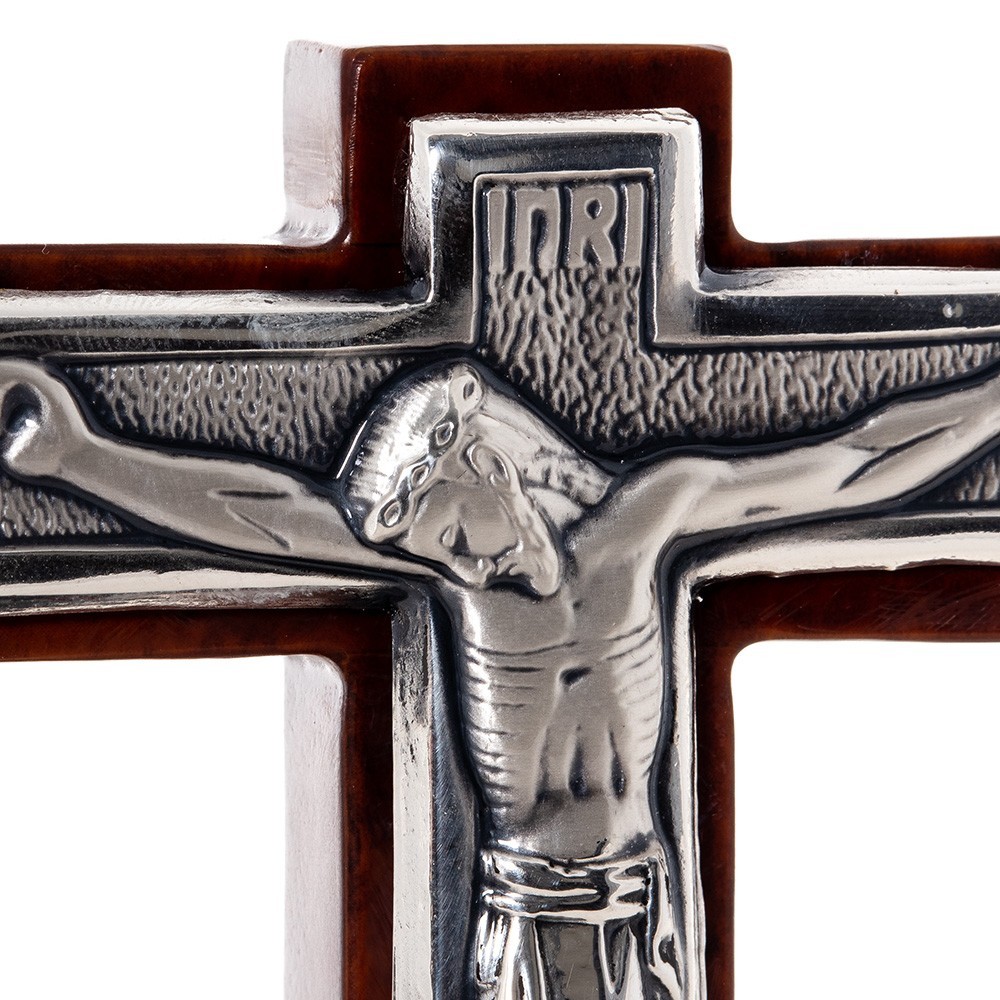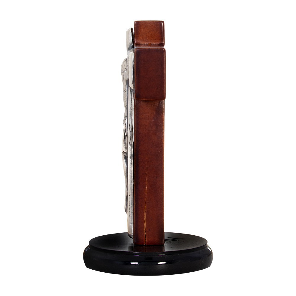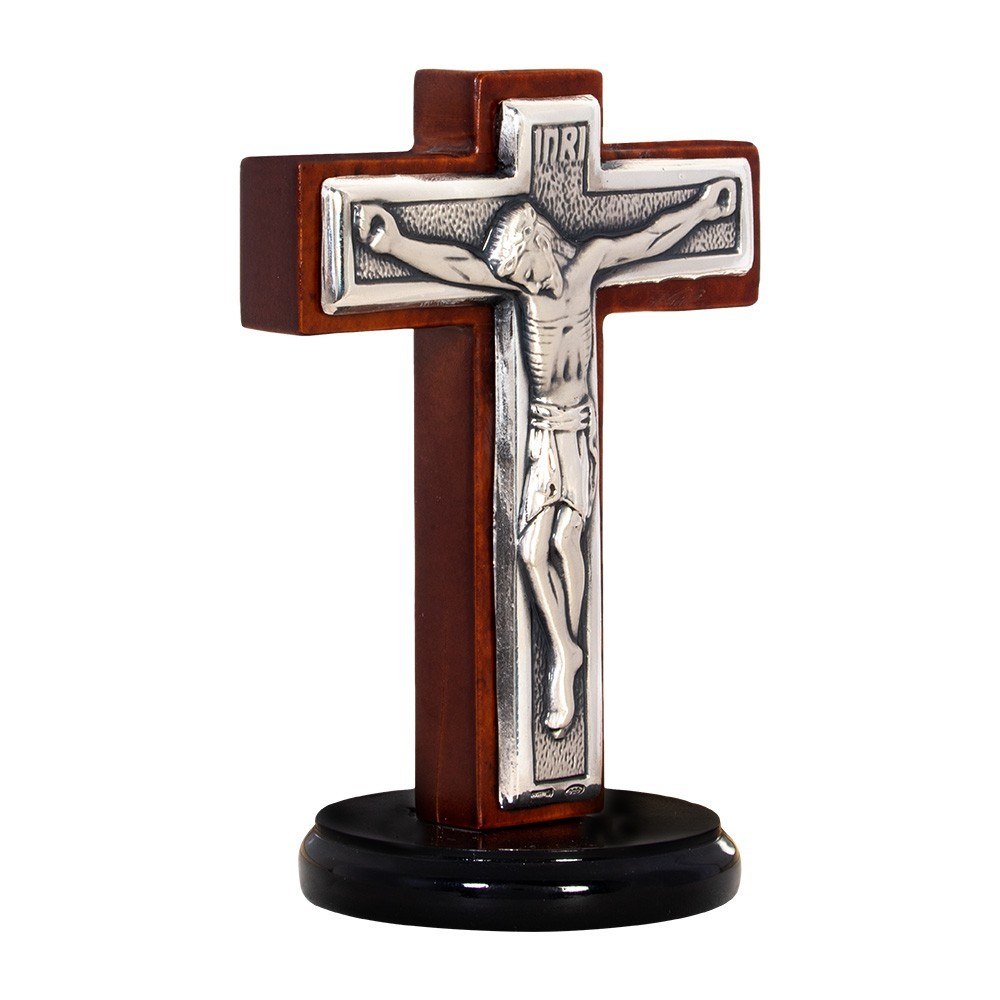 Piccolo e elegante crocifisso in legno e metallo. Il crocifisso è color mogano lucido con base tonda e placca in metallo argentato. Articolo realizzato in Itlia, con cura e precisione. Ottima idea regalo per qualsiasi occasione particolare.