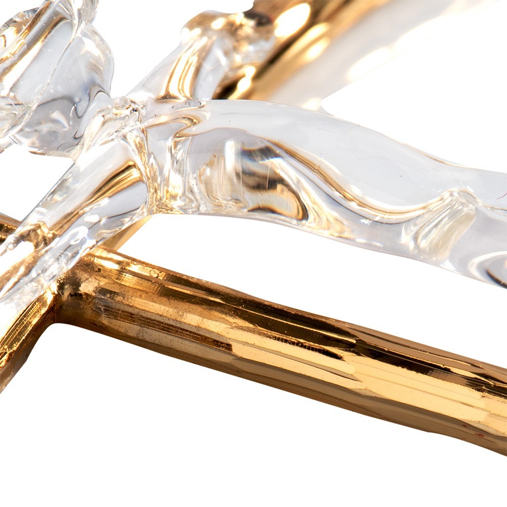 Crocifisso stilizzato dal design moderno, realizzato in metallo dorato con il Corpo di Cristo in cristallo soffiato. Completo di gancino in metallo dorato per poterlo appendere. Articolo di ottima qualità, realizzato in Italia. Corredato di scatola.