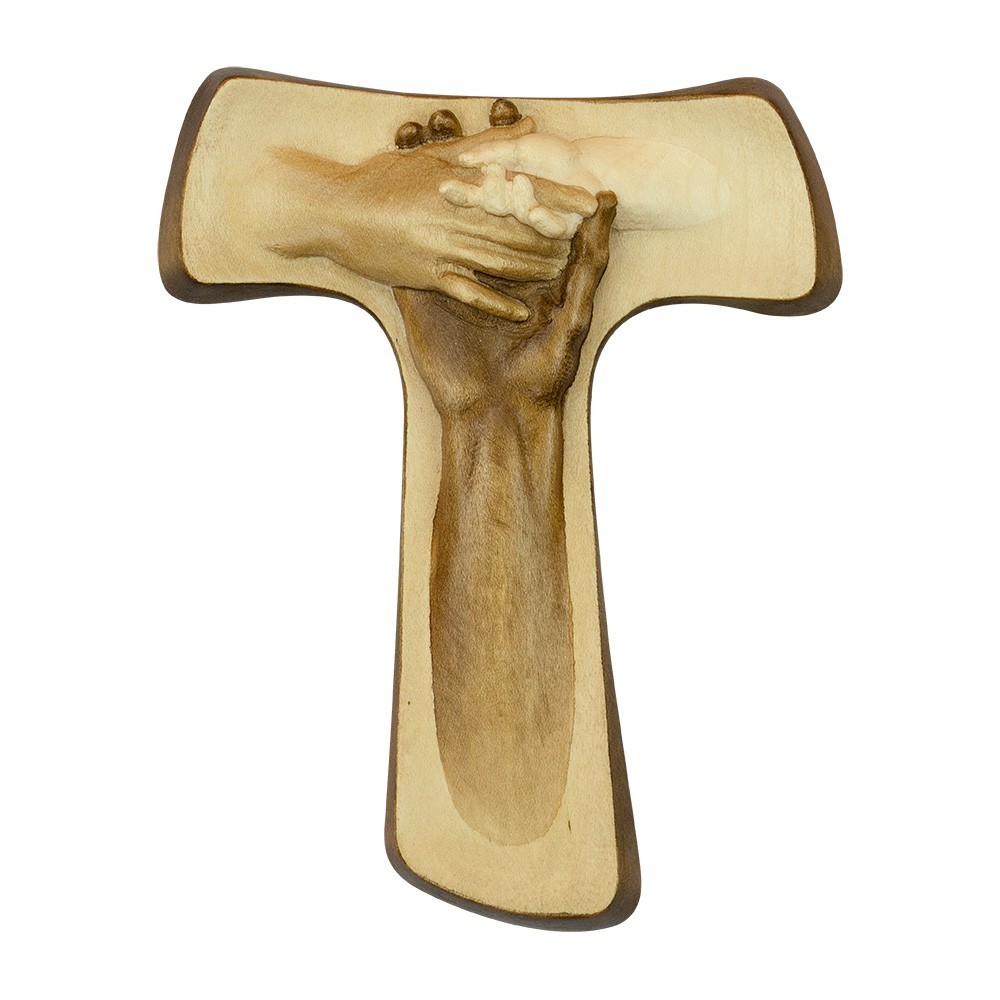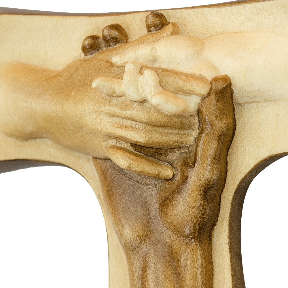 Croce dell'amicizia realizzata e dipinta in legno brunito multiplo con una patina marrone chiara-scura. Successivamente il prodotto viene protetto applicando una cera per mantenere la vivacità nel tempo. Articolo di grande pregio realizzato da esperti artigiani della Val Gardena.