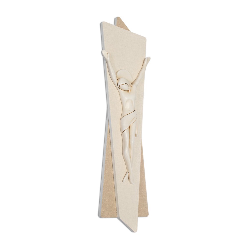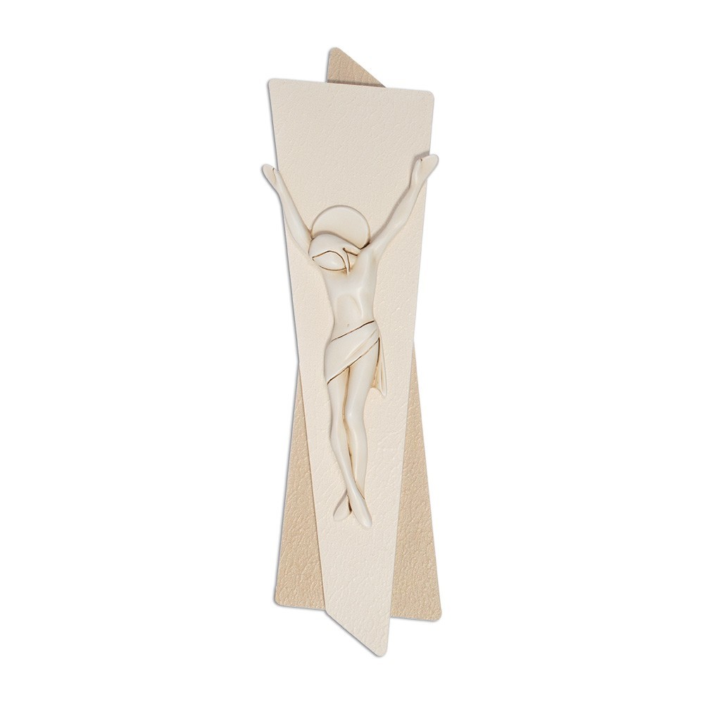 Grazioso crocifisso da parete in stile moderno con il Corpo di Cristo bianco. Il fondo è composto da due pannelli colorati in legno MDF. Questo crocifisso è perfetto per chi vuole arricchire qualsiasi ambiente della propria casa. Completo di foro in acciaio per poterlo appendere.