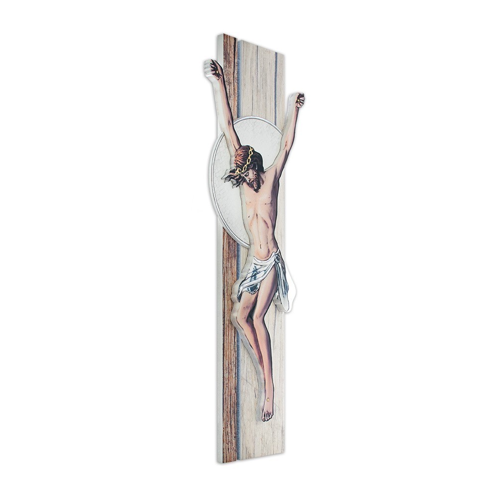 Crocifisso moderno su pannello in legno MDF. Sulla tavola vi è applicato la sagoma di Gesù Cristo arricchita con inserti in argento laminato. Soluzione ideale per chi vuole arredare la propria casa con gusto e originalità. Articolo 100% made in Italy. Completo di foro in acciaio per poterlo appendere.