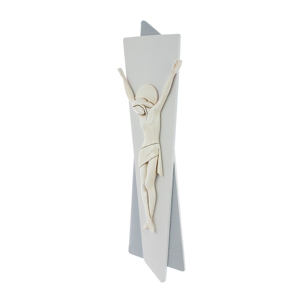 Moderno crocifisso realizzato su due pannelli stilizzati e sovrapposti con colori differenti. Sui pannelli è applicato il Corpo di Gesù Cristo. Soluzione perfetta per chi vuole arricchire con eleganza qualsiasi ambiente della propria casa. Completo di foro in acciaio per poterlo appendere.