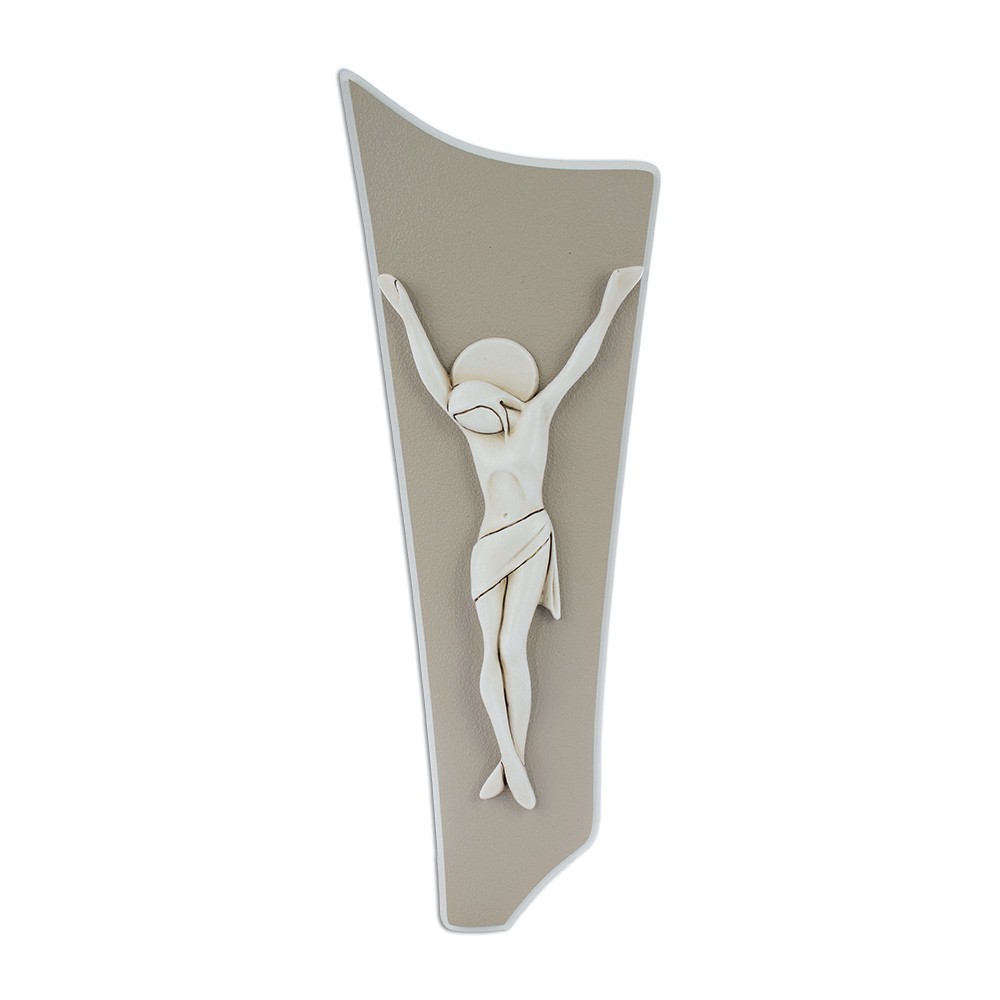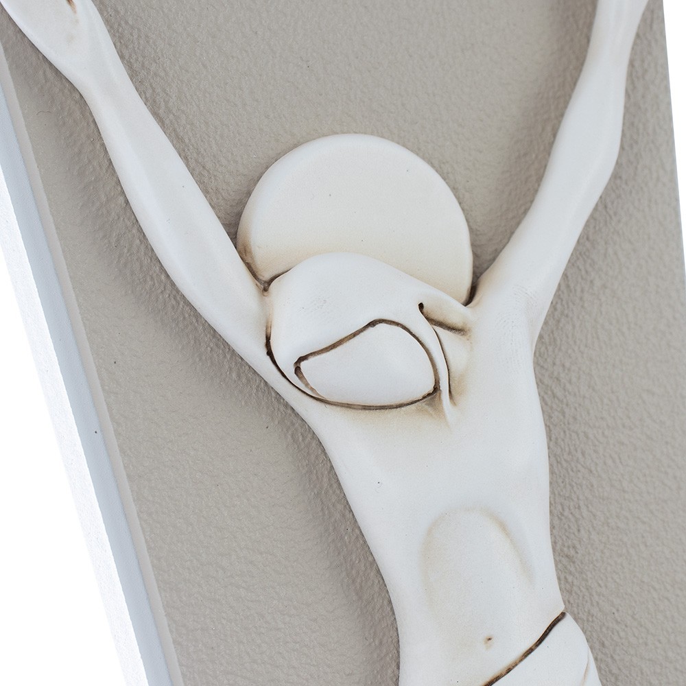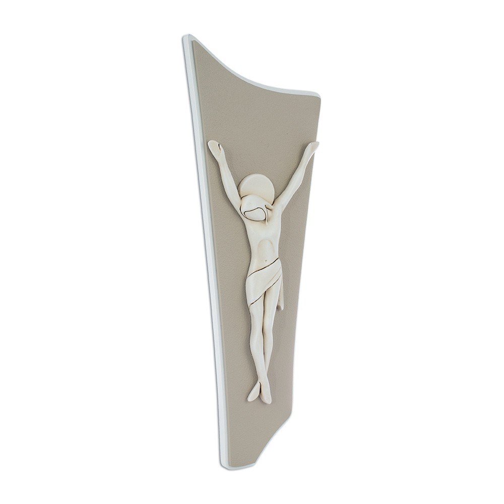 Crocifisso da parete in stile moderno con il Corpo di Cristo. Il fondo è composto da due pannelli sovrapposti colorati bianco e beige. Questo crocifisso è perfetto per chi vuole arredare con eleganza qualsiasi ambiente della propria casa. Fornito di forellino in acciaio per poterlo appendere. Ideato e prodotto in italia, con cura e attenzione ai dettagli.