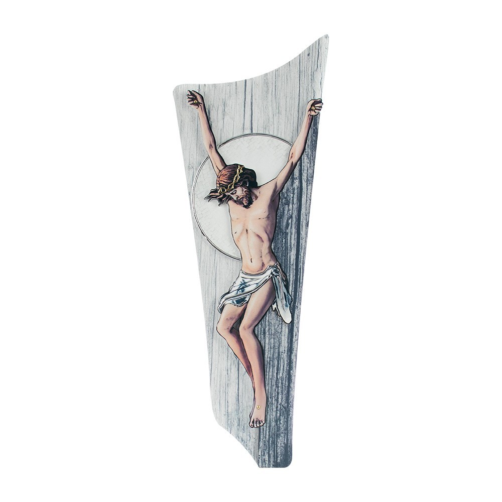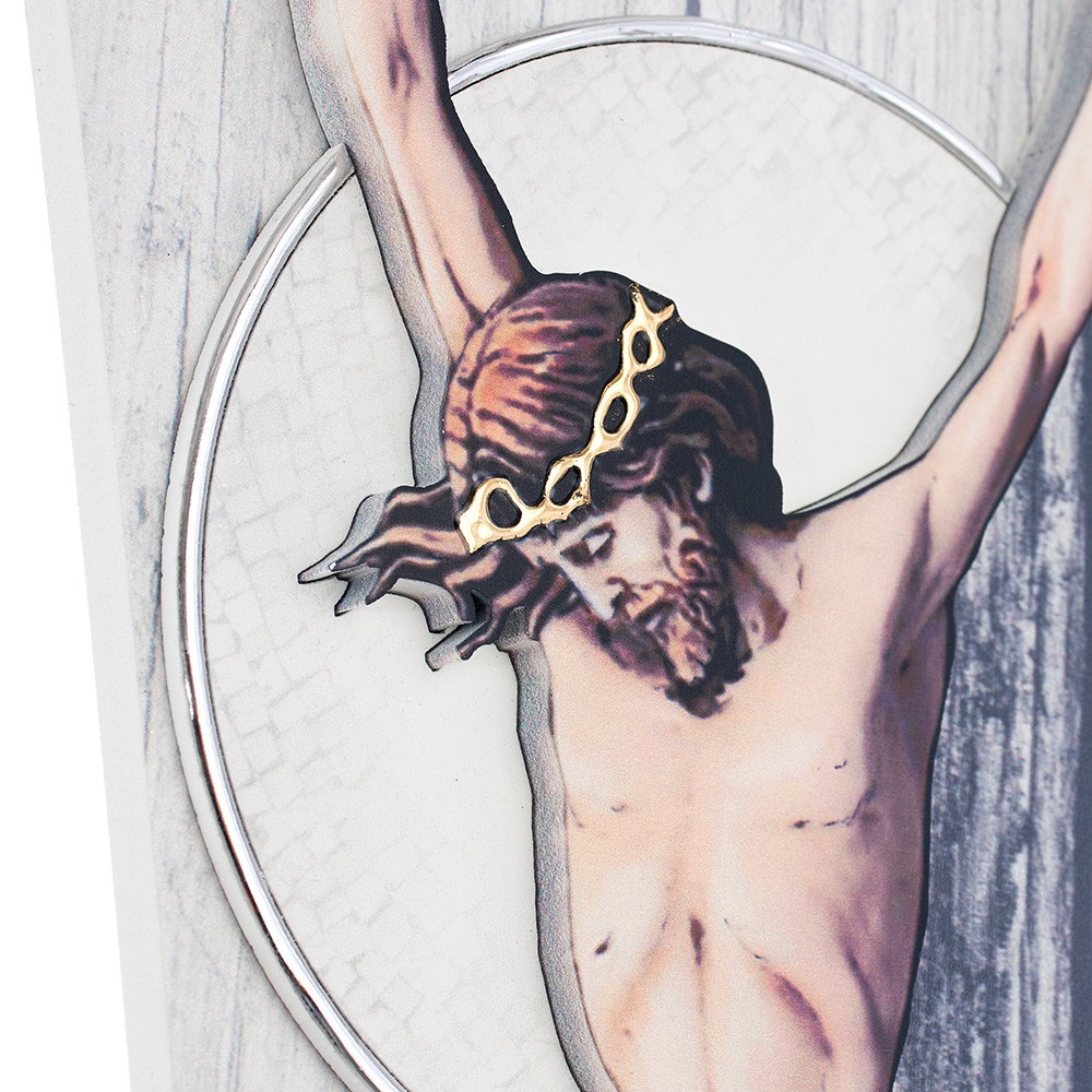 Crocifisso moderno su pannello in legno MDF. Sul pannello vi è applicato la sagoma di Gesù Cristo arricchita con decori in argento laminato. E' un articolo made in Italy, fa parte della collezione Estego quadri d'autore, frutto del talento dell'artista luigi Pesaresi, con materiali pregiati e rifiniti con preziose decorazioni.