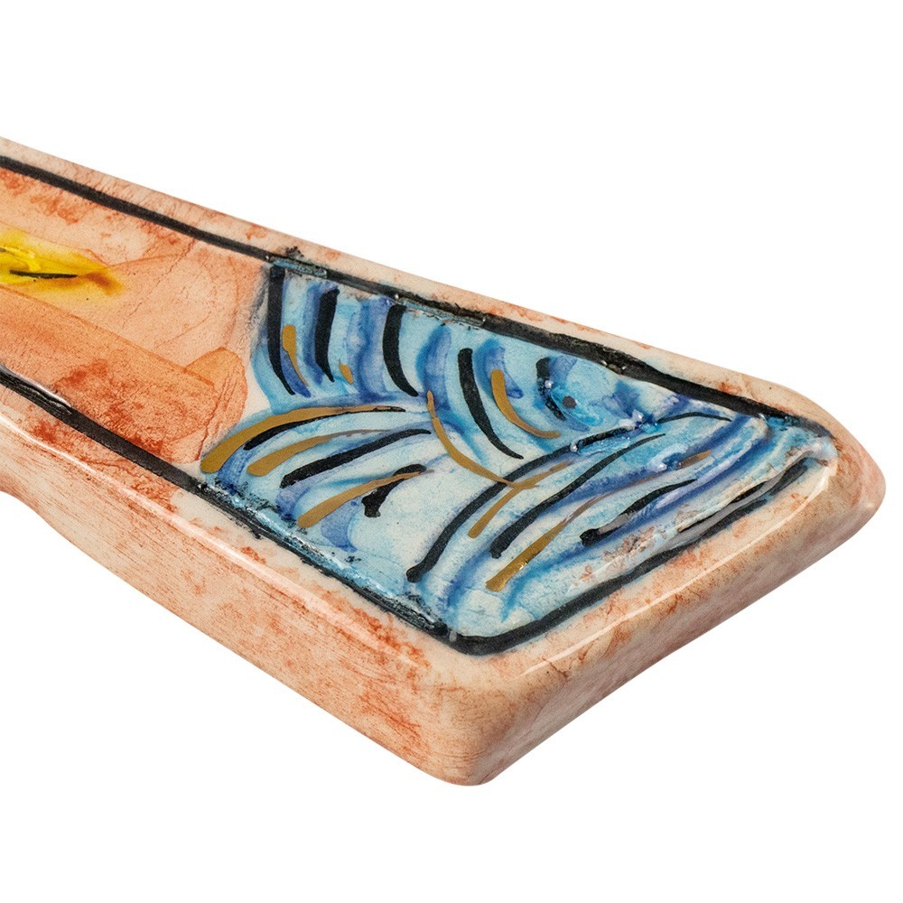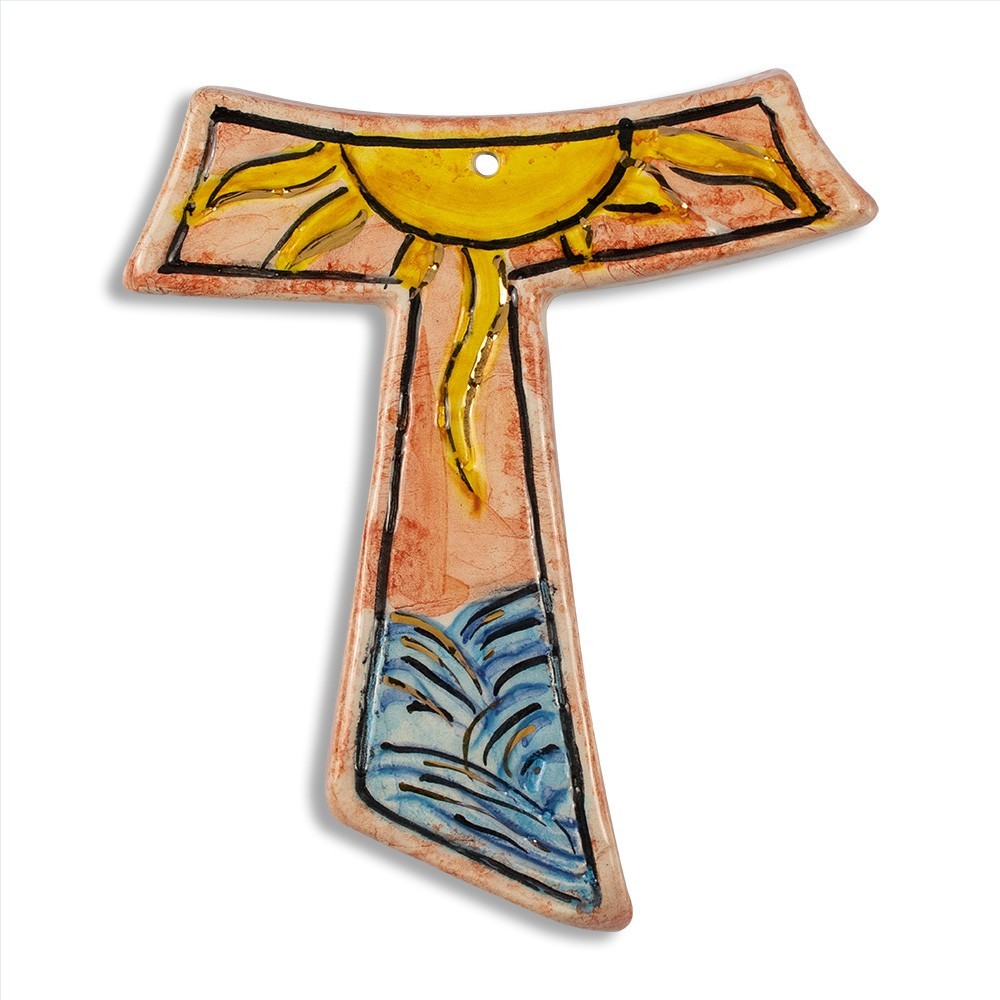 Croce tau in ceramica decorato.