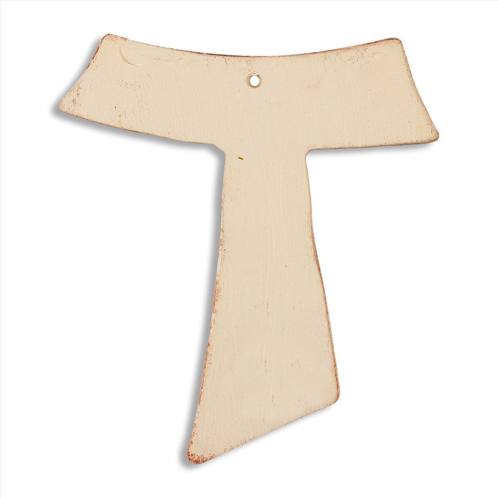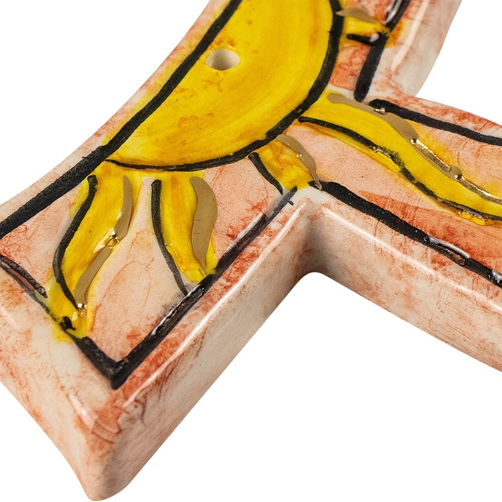 Piccolo e grazioso crocifisso a forma di Tau, realizzato in ceramica e decorato finemente a mano.