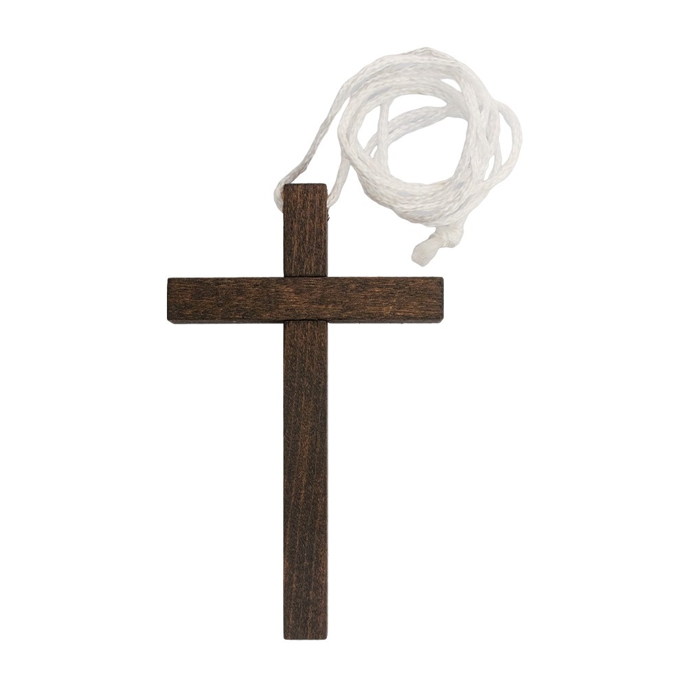 Questa croce per tunichetta Prima Comunione è interamente in legno scuro ed è completa di laccetto in corda bianco.