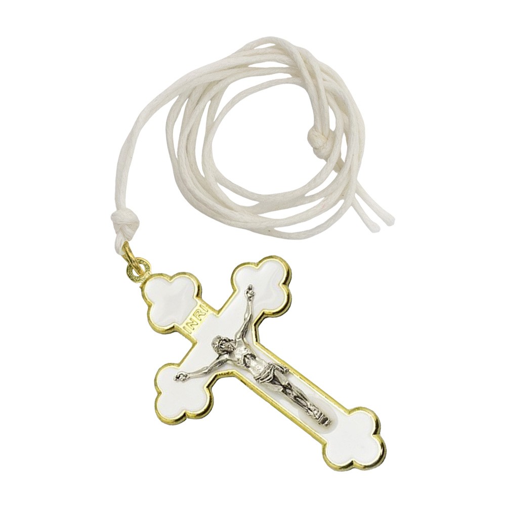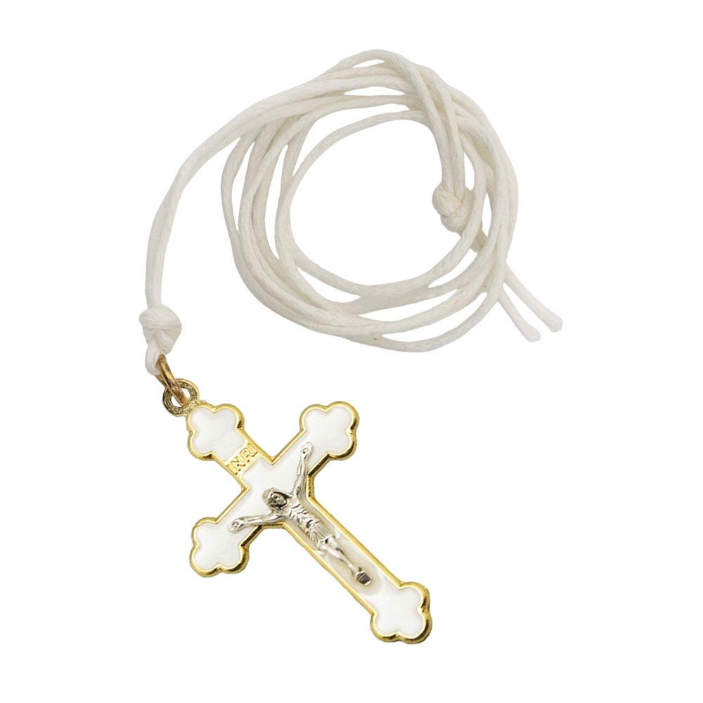 Croce per Prima Comunione in metallo dorato con smalto Bianco simile alla madreperla. Corredata di laccio bianco.