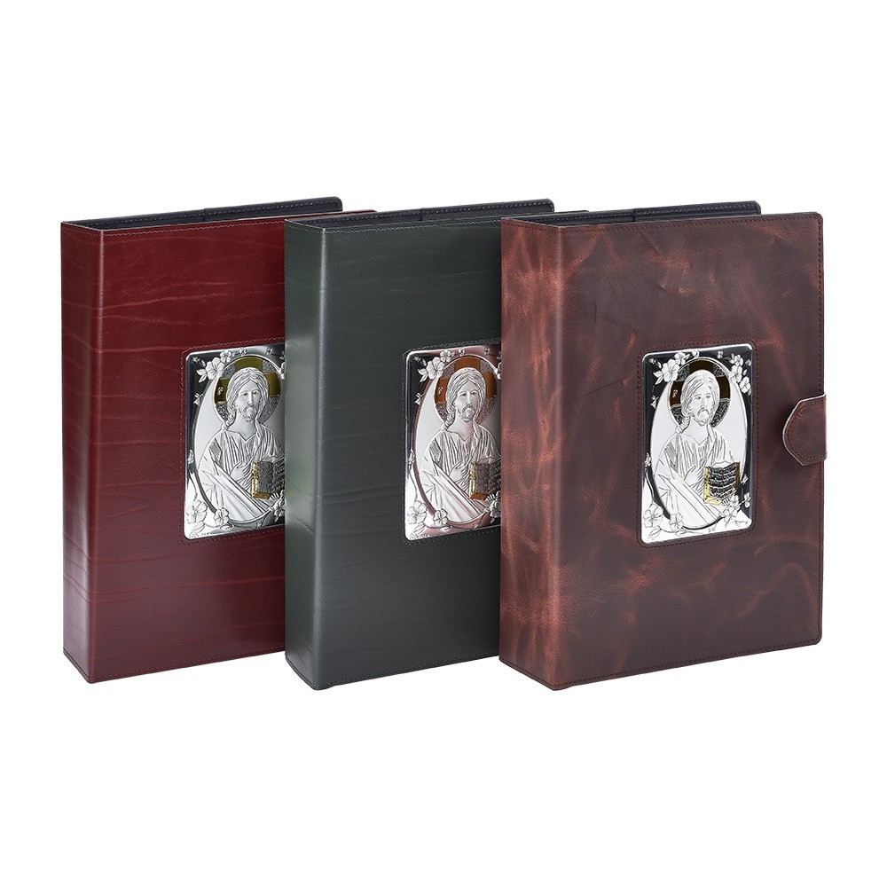 Copri bibbia in vera pelle marrone con placca argento bilaminato.